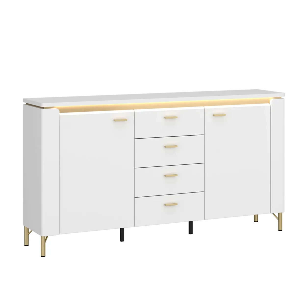 Eleganz trifft auf Funktionalität im Lazio Sideboard. Die Frontbeleuchtung mit einem integrierten LED-Band verleiht dem Möbelstück einen modernen Touch und setzt stilvolle Akzente in jedem Raum. Das Design in weißem Hochglanz mit goldfarbenen Absetzungen strahlt zeitlose Raffinesse aus und fügt sich harmonisch in verschiedene Einrichtungsstile ein.