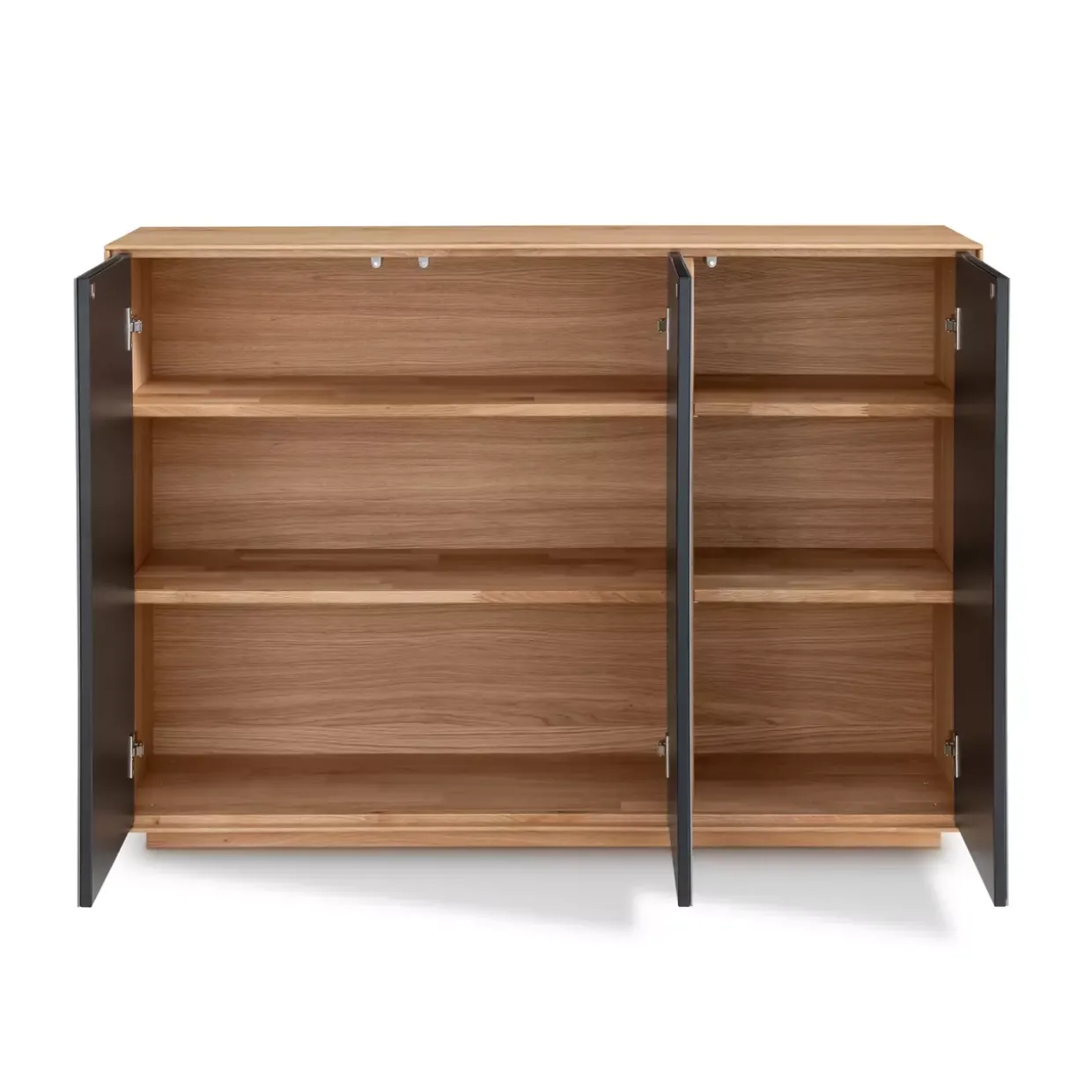 Die hochwertige Verarbeitung aus Eiche und Wildeiche verleiht dem Möbelstück nicht nur Stabilität, sondern auch eine warme Ausstrahlung. Die Oberfläche, wahlweise melaminharzbeschichtet oder geölt, garantiert Langlebigkeit und Schutz vor Abnutzung. Die Drehtüren des Sideboards sind mit einer innovativen Push-To-Open-Funktion ausgestattet, die ein müheloses Öffnen ermöglicht. Ergänzt wird dieser Komfort durch das Soft-Close-System, das ein sanftes und geräuschloses Schließen der Türen gewährleistet.