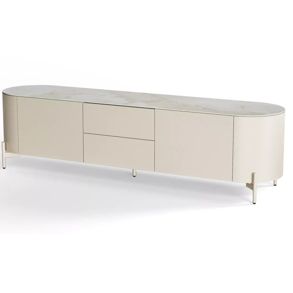 Ein Hauch von Modernität zieht in Ihr Zuhause ein mit diesem stilvollen Sideboard. Die raffinierte Kombination aus robustem Stahl und eleganter Keramik verleiht dem Möbelstück eine edle Ausstrahlung. Die Abdeckplatte aus Keramik im Farbton Reve De Rex Perla sorgt für ein luxuriöses Ambiente und harmoniert perfekt mit den grauen Innenflächen.Zwei Türen und zwei Schubkästen bieten reichlich Stauraum für all Ihre Habseligkeiten. Die klaren Linien und die dezente Farbgebung in Austern Weiß Metall machen das Sideboard zu einem zeitlosen Begleiter, der sich mühelos in verschiedene Raumkonzepte einfügt. Ob im Wohnzimmer, Esszimmer oder Flur, dieses Möbelstück bietet nicht nur Funktionalität, sondern auch ein ästhetisches Erlebnis.Die hochwertige Verarbeitung und das durchdachte Design garantieren Langlebigkeit und Stabilität. Der Einsatz von Keramik und Stahl sorgt für eine leicht zu pflegende Oberfläche, die im Alltag beständig bleibt. Diese Kombination aus Materialien und Farben schafft eine Atmosphäre von Ruhe und Eleganz, die jeden Raum aufwertet. So wird das Sideboard nicht nur zum praktischen Element, sondern auch zum stilvollen Mittelpunkt Ihres Zuhauses. Entdecken Sie die Vielfalt der modernen Einrichtung und erleben Sie, wie Design und Funktionalität in perfekter Harmonie verschmelzen.
