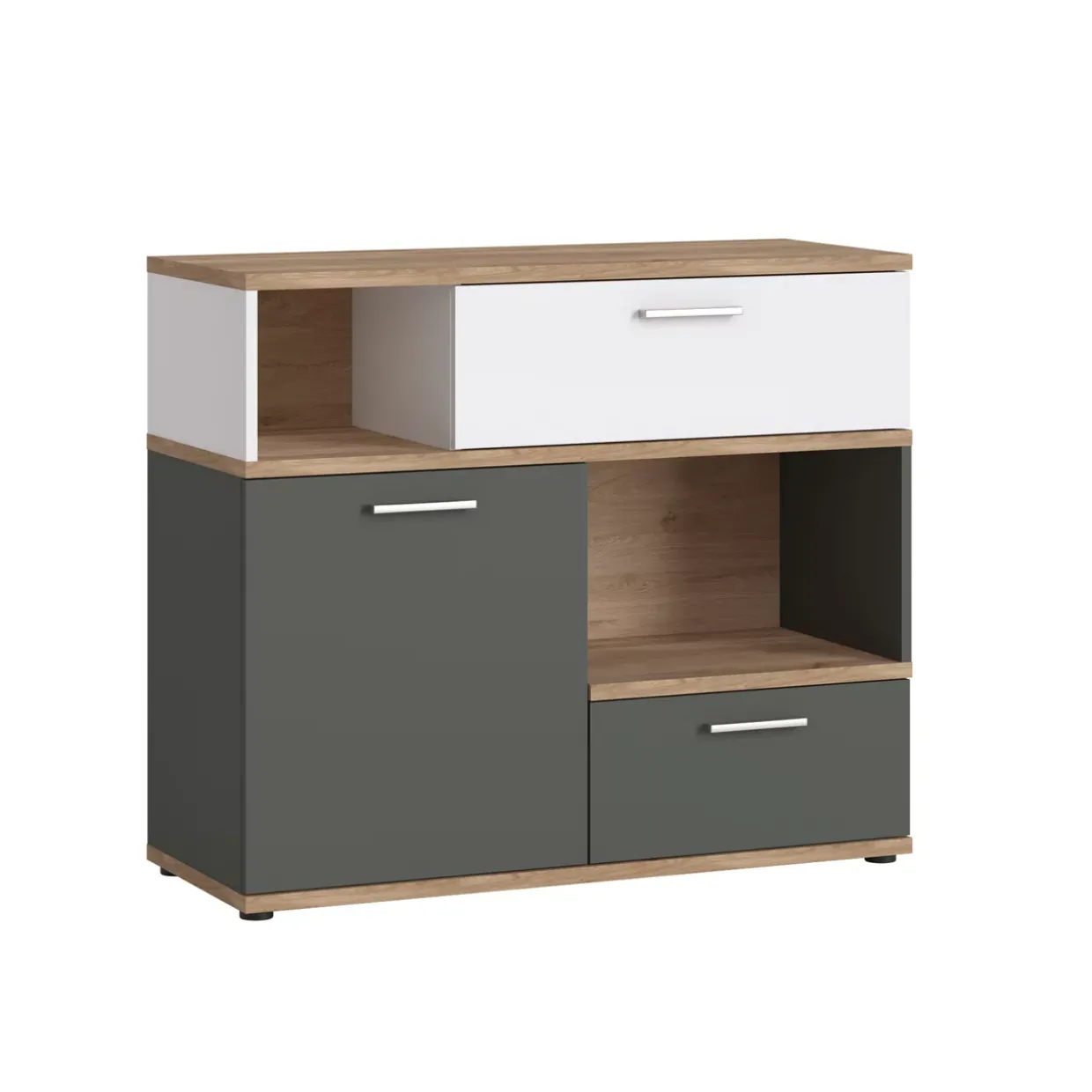 Mit einer praktischen Drehtür und zwei Schubkästen bietet die Kommode großzügigen Stauraum. Der Vollauszug der Schubkästen ermöglicht einen bequemen Zugriff auf den gesamten Inhalt, was besonders im Alltag von Vorteil ist. Die klare, eckige Form unterstreicht den modernen Stil und macht das Möbelstück zu einem Hingucker in jedem Raum.