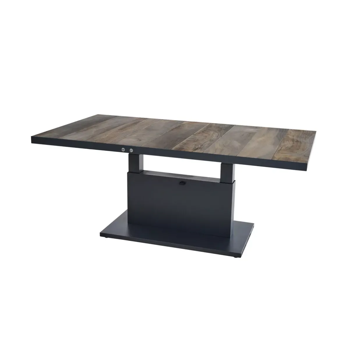 Ein Hauch von urbanem Charme trifft auf funktionale Eleganz. Der Lifttisch im Loft-Stil beeindruckt durch seine matt anthrazitfarbene Oberfläche und verleiht Ihrem Raum eine moderne Ästhetik. Das ganze Jahr über bietet dieser Tisch einen stilvollen Mittelpunkt für Ihr Zuhause.Robuste Säulenfüße aus hochwertigem Aluminium sorgen für Stabilität und Langlebigkeit. Die metallische Struktur spiegelt den industriellen Charakter wider und fügt sich nahtlos in zeitgemäße Einrichtungskonzepte ein. Der Tisch besticht nicht nur durch seine Optik, sondern auch durch seine praktische Vielseitigkeit.Ein besonderes Highlight ist der innovative Pop-Up-Mechanismus, der es ermöglicht, die Tischplatte von 140 cm auf 180 cm zu erweitern. Diese Funktion bietet Ihnen Flexibilität bei der Nutzung, egal ob für ein Abendessen oder eine lebhafte Runde mit Gästen. Darüber hinaus lässt sich die Höhe des Tisches dank der Lift-Funktion stufenlos verstellen. Diese Anpassungsfähigkeit macht ihn zu einem idealen Begleiter für unterschiedliche Gelegenheiten und Bedürfnisse. Ein Tisch, der sowohl durch seine Funktionalität als auch durch sein Design überzeugt – perfekt für alle, die Wert auf Qualität und Stil legen. Bereichern Sie Ihre Wohnumgebung mit diesem vielseitigen Möbelstück.