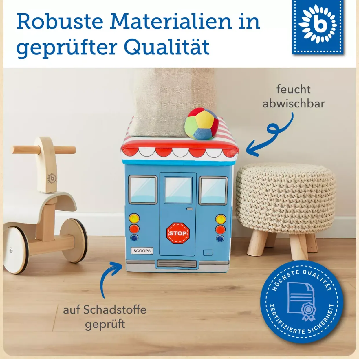 Unsere 2in1 Staubox Icecream besteht aus einer hochwertigen Kombination von Kunststoff und Stoff, die für Langlebigkeit und Stabilität sorgt. Diese Materialien machen die Sitzbank nicht nur robust, sondern auch angenehm in der Haptik, sodass sie sich ideal als zusätzliche Sitzgelegenheit eignet. Ob im Kinderzimmer, Wohnzimmer oder Flur – diese Staubox passt sich mühelos an verschiedene Einrichtungsstile an und bietet reichlich Stauraum für Spielzeug, Decken oder andere Utensilien, die Sie schnell und unkompliziert verstauen möchten.