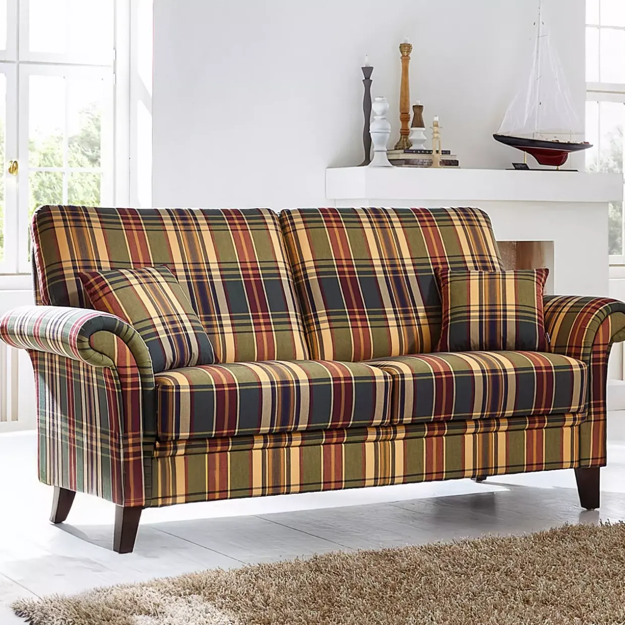 Grün karierte Muster verleihen dem Capri Plus Sofa 2,5-sitzig einen klassischen Charme, der sich nahtlos in ein konventionelles Wohnambiente einfügt. Das Sofa kombiniert die natürliche Eleganz von massivem Buchenholz in maronfarbiger Ausführung mit der Weichheit hochwertiger Stoffmaterialien. Diese harmonische Verbindung von Holz und Stoff bietet eine einladende Atmosphäre für jedes Wohnzimmer.