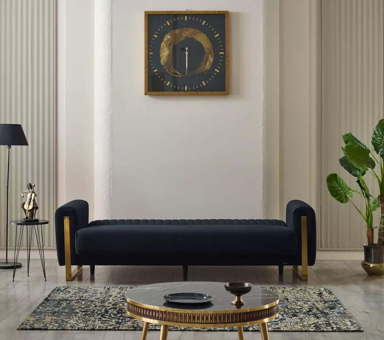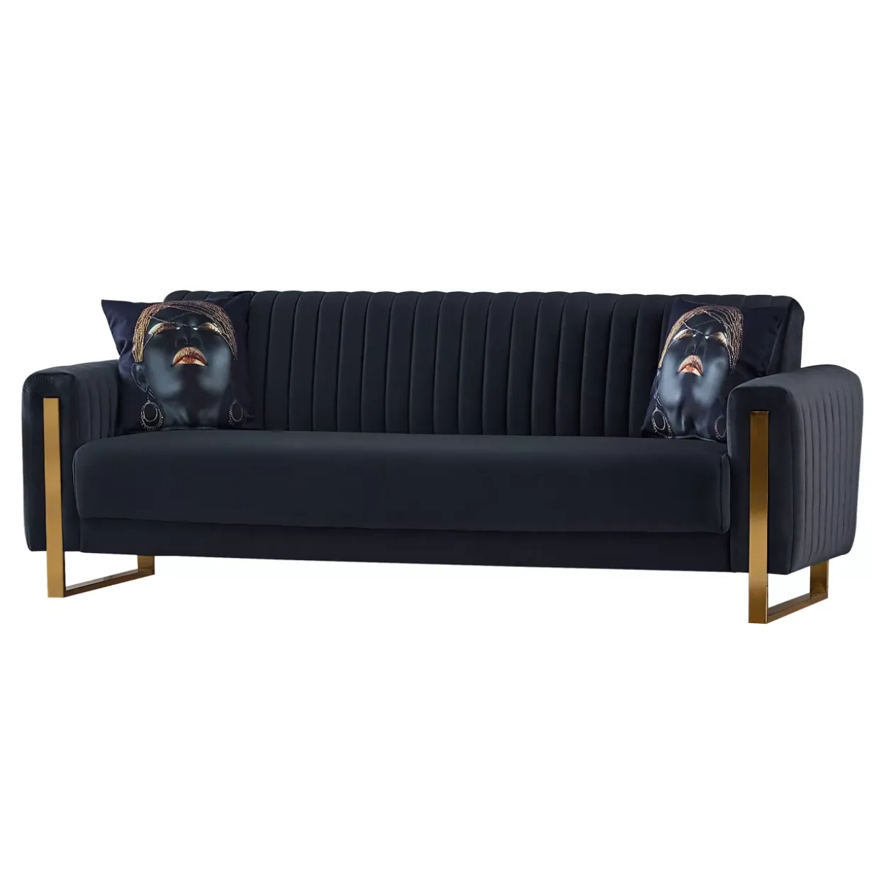 Ein Hauch von Glamour zieht ein mit dem Bogota 3-Sitzer, der in elegantem Soft-Schwarz und goldfarbenen Akzenten erstrahlt. Die Kombination aus Stoff und Metall verleiht diesem Möbelstück eine moderne und zugleich luxuriöse Ausstrahlung. Polyester als Textilart verspricht Langlebigkeit und Komfort, während die Kufen als Fußform einen stabilen Stand gewährleisten.