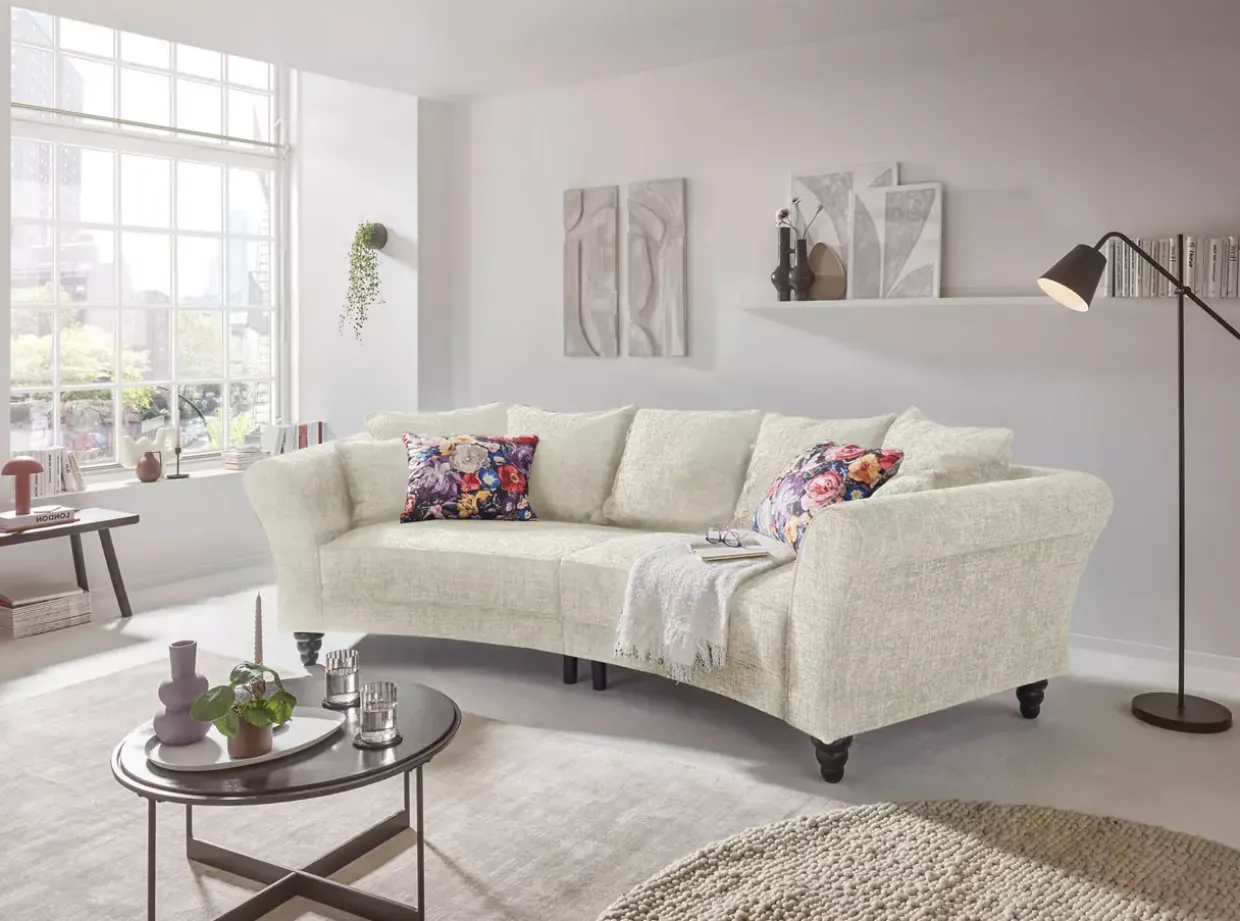 Das Zusammenspiel aus Stoff und massivem Holz sorgt nicht nur für Stabilität, sondern auch für ein behagliches Ambiente. Holz in tiefem Schwarz, kunstvoll lackiert, setzt einen edlen Akzent und harmoniert perfekt mit dem hellen Stoff. Diese Kombination macht das Sofa zu einem vielseitigen Möbelstück, das sich sowohl in traditionelle als auch in moderne Räume einfügt.