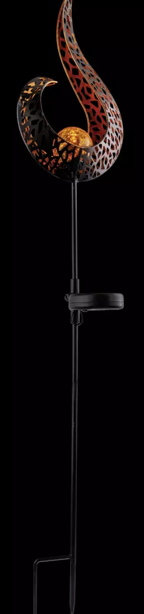 Solarleuchte Metall schwarz, Metall goldfarben, Glas gelb, Schiebeschalter, Akku inkludiert AA 300mAh 1.2V, IP44, Erdspitz mit Flamme, LxBxH: 165x65x900mm, inkl. LED 0.06W 3.2V, 3000K