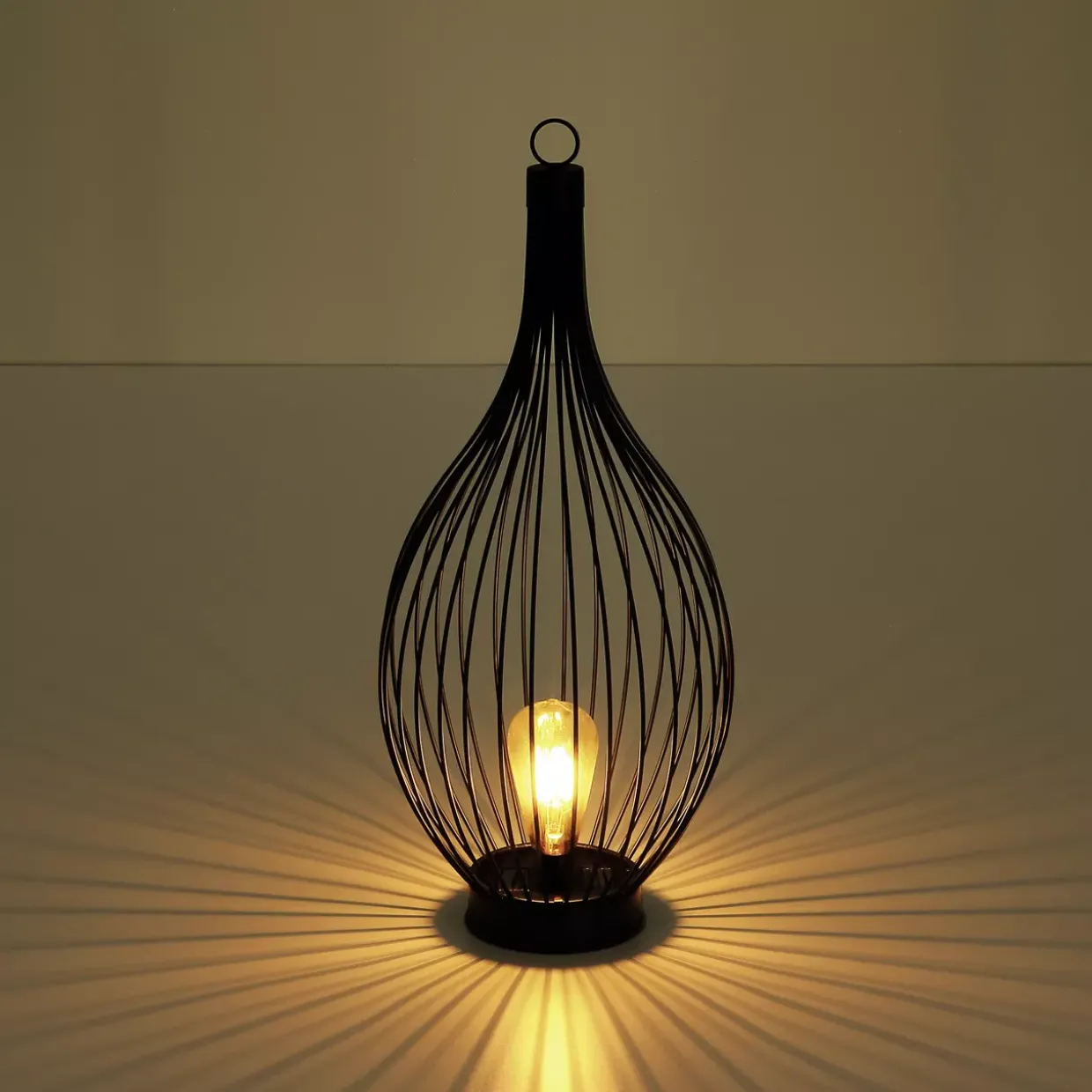 Solarleuchte Metall schwarz, Kunststoff amber, Druckschalter, Akku inkludiert AA 600mAh 1.2V, IP44, Laterne innen mit Filament LED , ø: 250mm, H: 570mm, inkl. LED 0.06W 3V, 3000K