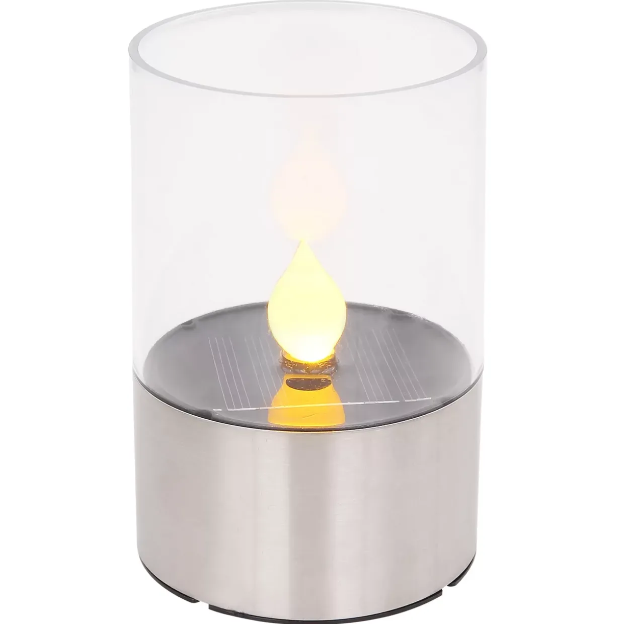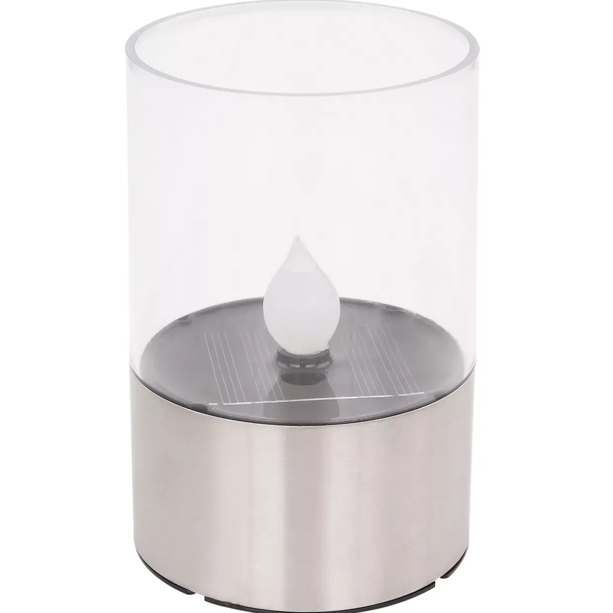 Solarleuchte Edelstahl, Kunststoff klar, Schiebeschalter, Fire Effect, Akku inkludiert AAA 100mAh 1.2V, IP44, ø: 75mm, H: 110mm, inkl. LED 0.06W 3.2V, 1800KDas Modell SOLAR vereint modernes Design mit Funktionalität. Mit seinem eleganten Edelstahl-Look passt es perfekt in jeden Außenbereich. Diese Solarleuchte bietet Ihnen das ganze Jahr über stimmungsvolles Licht, betrieben durch umweltfreundliche Solartechnologie. Der warmweiße Flackereffekt erinnert an ein gemütliches Feuer und sorgt für eine einladende Atmosphäre. Durch die Kombination aus Kunststoff und hochwertigem Edelstahl ist die Leuchte robust und langlebig. Trotz des modernen Stils wird auf eine praktische Handhabung nicht verzichtet: Die integrierte LED-Technologie ist energieeffizient und das Leuchtmittel ist bereits im Lieferumfang enthalten.Mit einem Durchmesser von 7,5 cm ist die SOLAR-Solarleuchte kompakt und fügt sich harmonisch in jedes Gartenarrangement ein. Die Lichtfarbe mit einer Farbtemperatur von 1800 Kelvin sorgt für ein angenehmes, warmes Licht, das Ihre Außenbereiche in ein sanftes Leuchten taucht. Die Leuchte ist nicht dimmbar, was jedoch den gleichmäßigen Flackereffekt nicht beeinträchtigt.Perfekt geeignet für all jene, die Funktionalität und Stil in ihren Außenbereich integrieren möchten. Die SOLAR-Solarleuchte ist die ideale Wahl für eine stimmungsvolle Beleuchtung, die sowohl ästhetisch als auch umweltfreundlich ist.