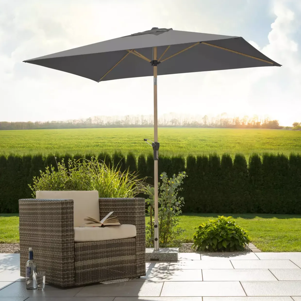 Mit seinem großzügigen Maß von 230×150 cm bietet der Cordoba ausreichend Schattenfläche, um an sonnigen Tagen entspannte Stunden im Freien zu genießen. Die stabile Konstruktion ermöglicht eine einfache Handhabung und gewährleistet, dass der Schirm sicher an seinem Platz bleibt. Anthrazit als Farbwahl fügt sich harmonisch in unterschiedliche Umgebungen ein und ergänzt sowohl klassische als auch moderne Gartenmöbel auf stilvolle Weise.