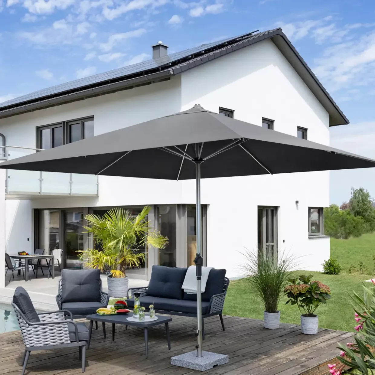 Ein moderner Stil verleiht jedem Außenbereich eine elegante Ausstrahlung. Der Sonnenschirm in der Farbe Anthrazit fügt sich harmonisch in zeitgemäße Umgebungen ein und bietet eine stilvolle Schattierungslösung. Er kombiniert die Robustheit von Metall mit der Vielseitigkeit von Kunststoff, was ihn nicht nur langlebig, sondern auch pflegeleicht macht.