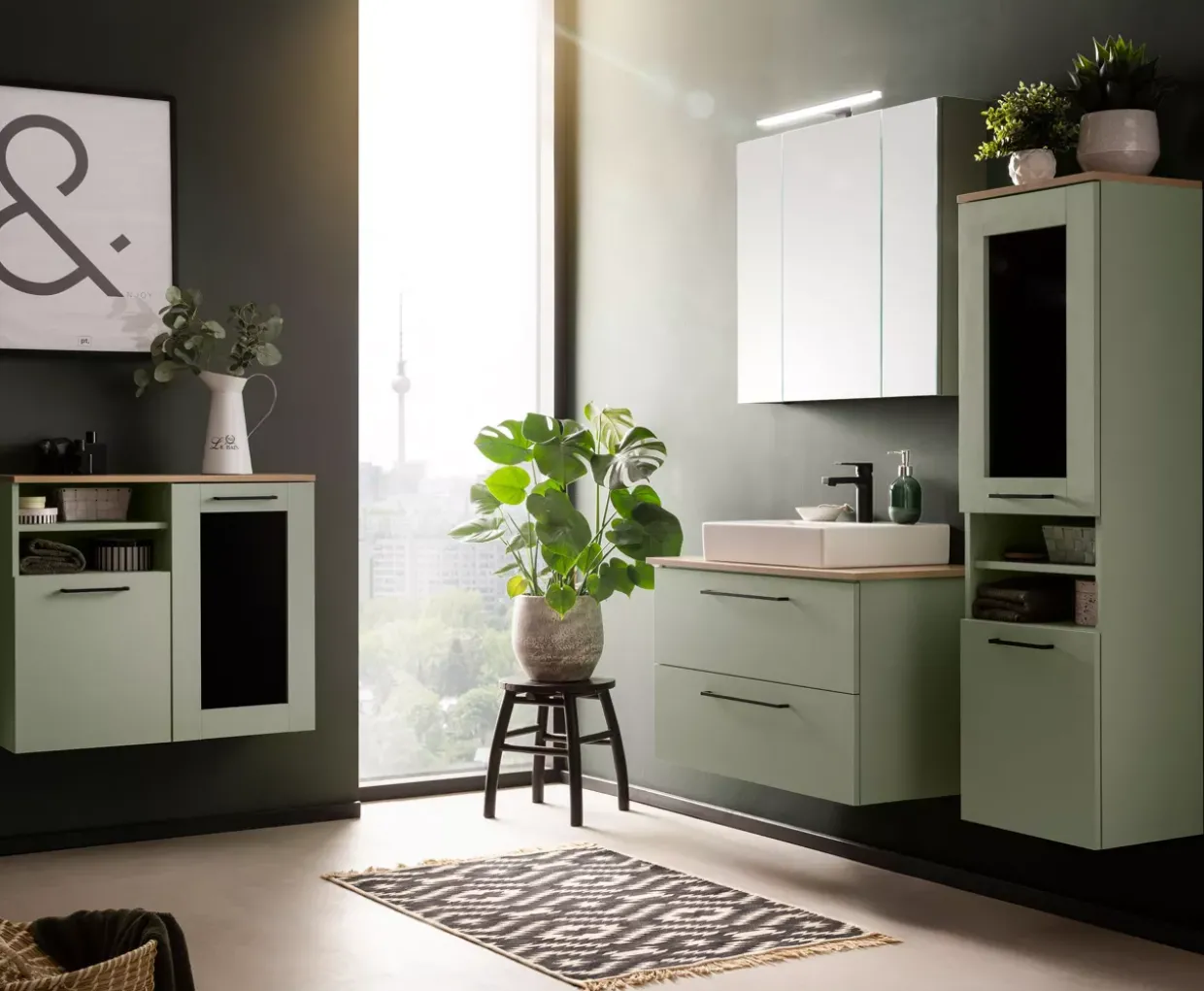 Ein elegantes Zusammenspiel von Glas und Holzwerkstoff zeichnet den Malo Spiegelschrank Korpus aus. In einem modernen Stil gehalten, fügt sich dieses Möbelstück harmonisch in zeitgemäße Wohnräume ein. Die pistazienfarbene Oberfläche verleiht dem Raum eine frische und stilvolle Note.