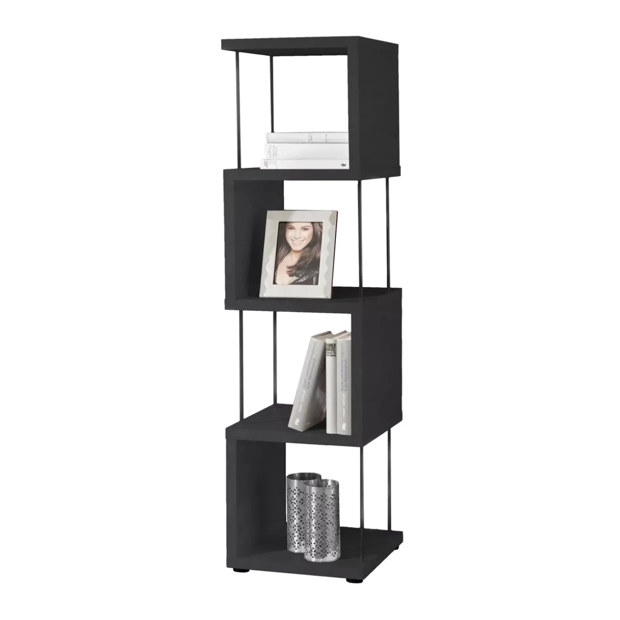 Schwarzstahl verleiht dem modernen Regalmodell „Sticks“ eine elegante und zeitlose Optik. Die eckige Form fügt sich nahtlos in jedes zeitgemäße Interieur ein und bietet einen stilvollen Blickfang. Aus hochwertigen Holzwerkstoffen und Kunststoff gefertigt, kombiniert es Robustheit mit einem leichten Erscheinungsbild. Die folierte Oberfläche sorgt für eine pflegeleichte Handhabung und bewahrt ihre Schönheit über Jahre hinweg.