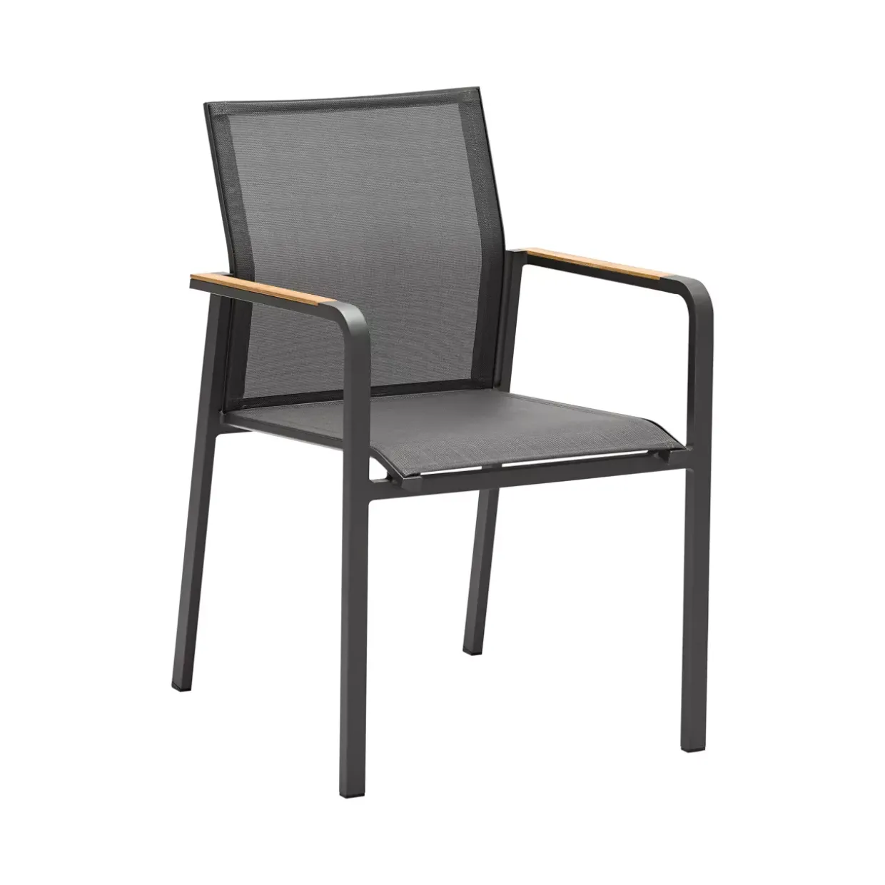 Teakarmlehnen, die formschön eingelassen sind, verleihen diesem Stapelstuhl eine besondere Eleganz. Das moderne Design fügt sich nahtlos in zeitgenössische Umgebungen ein und wird durch eine raffinierte Farbauswahl von carbon grey, graphite und Teak abgerundet. Eine Kombination aus hochwertigen Materialien wie Aluminium, Textil und Teakholz garantiert nicht nur ein ansprechendes Aussehen, sondern auch Langlebigkeit und Widerstandsfähigkeit.