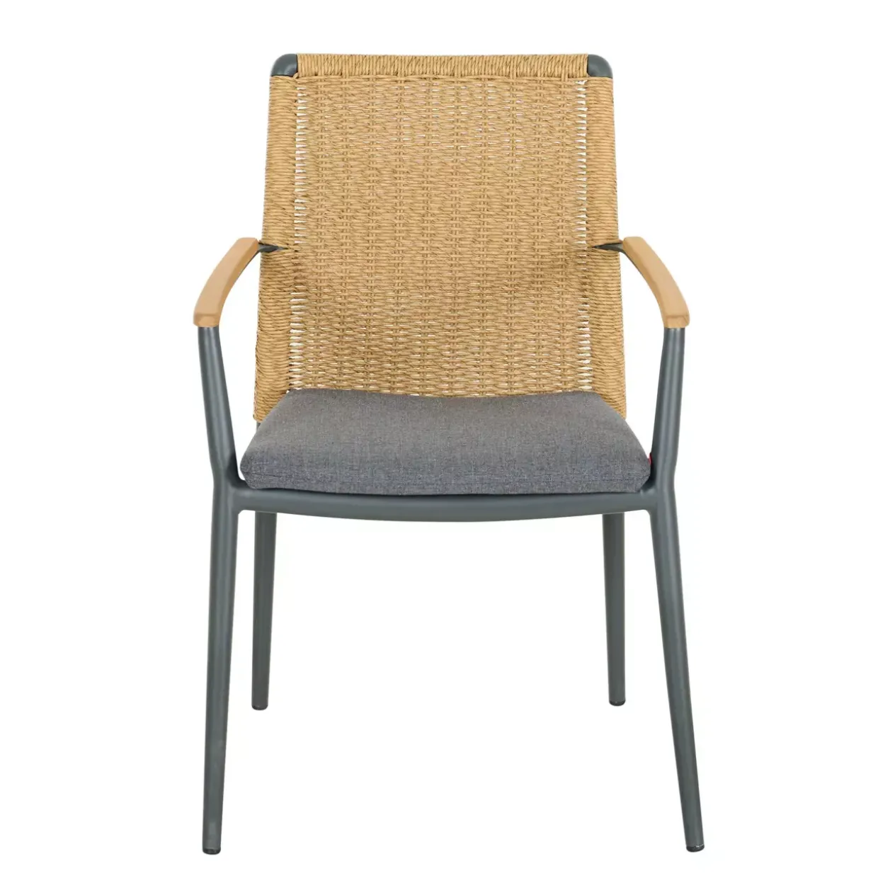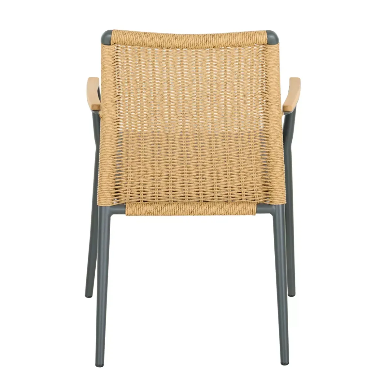 Teakholz, bekannt für seine Langlebigkeit und Widerstandsfähigkeit, macht diesen Stapelsessel zu einer verlässlichen Wahl für den Außenbereich. Es widersteht den Elementen und altert mit Anmut, was bedeutet, dass Ihr Gartenstuhl über Jahre hinweg attraktiv bleibt. Das Metallgestell ergänzt das Holz perfekt, indem es zusätzliche Stabilität bietet und gleichzeitig die moderne Formgebung unterstreicht.
