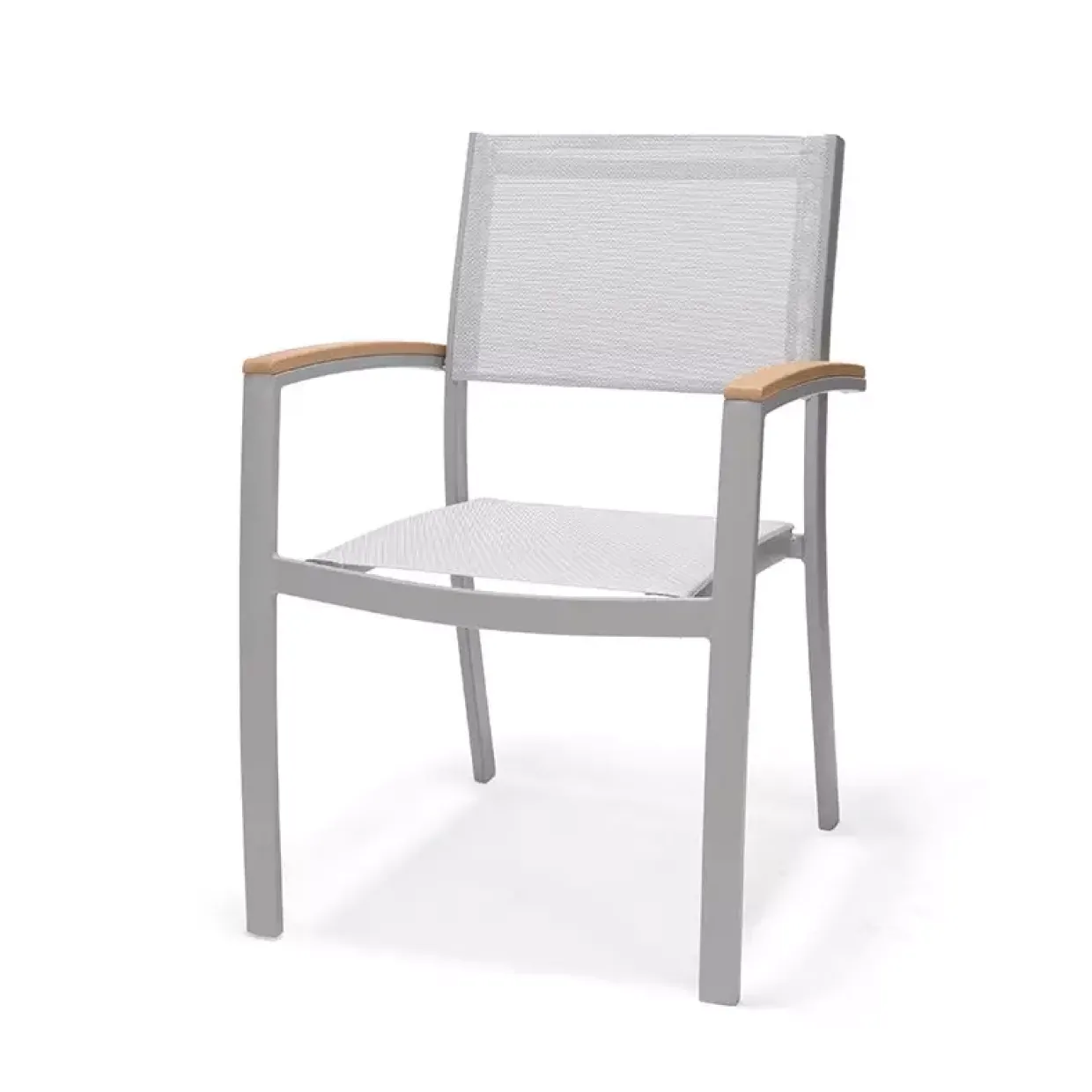 Stapelstuhl SYLT; Gestell: Aluminium pulverbeschichtet; Sitz: Textilene; Farbe: hellgrau ; Armlehnen: Eukalyptusholz;