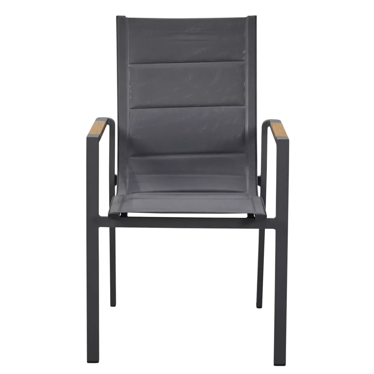 mit Teak-Armlehnen; Sitz- und Rückenlehne aus Textilene, gepolstert; Farbe: anthrazit; Gestell: Aluminium, anthrazit; mit Teakholz-Armlehnen