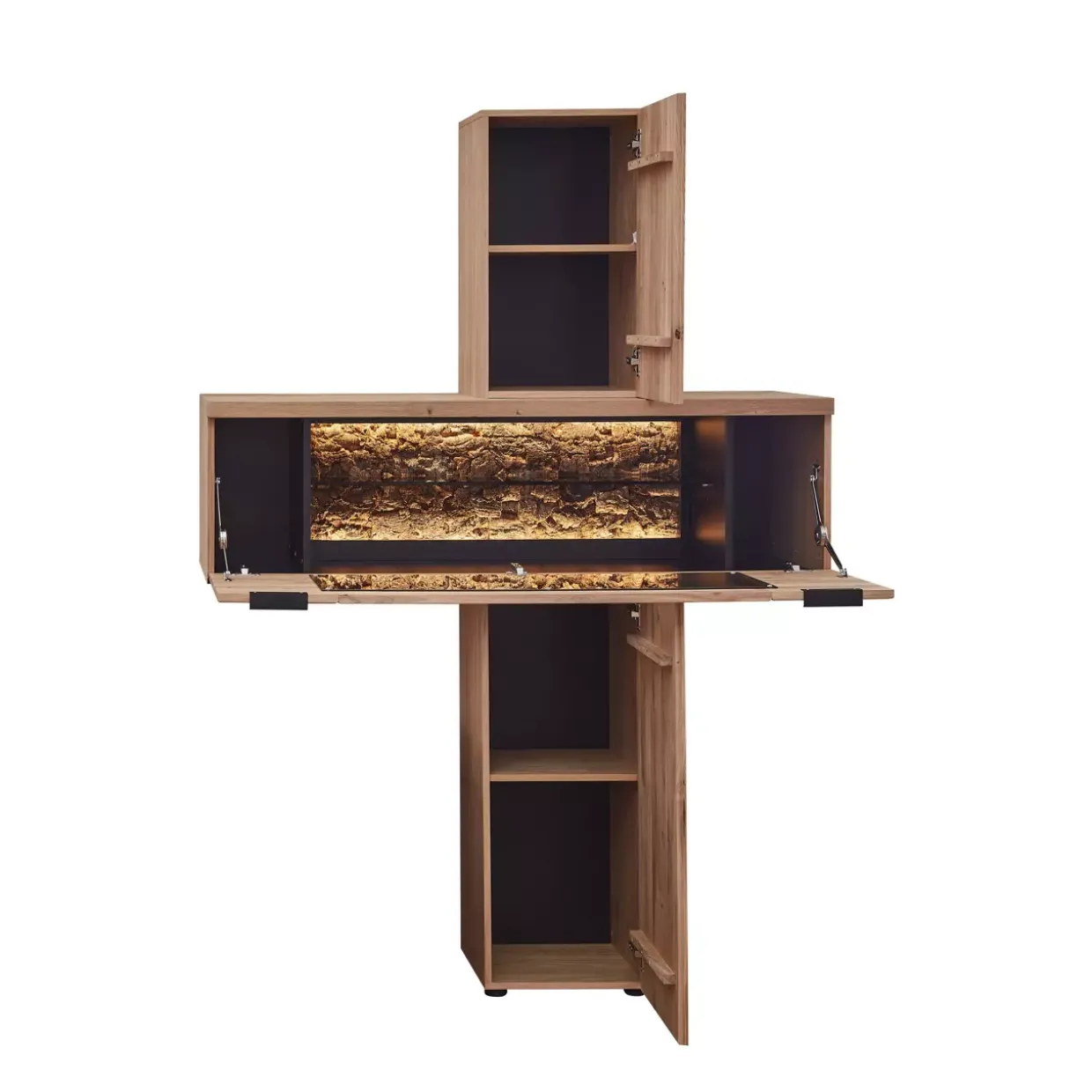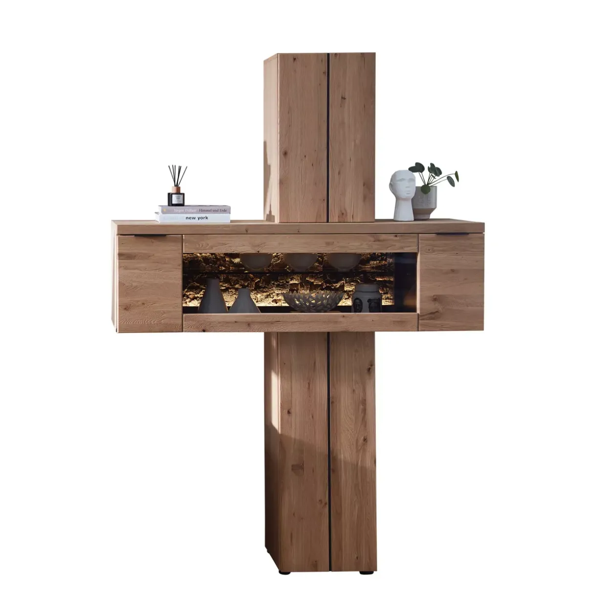 Ein Hauch von Natur trifft auf moderne Eleganz: Das Regal aus massiver Wildeiche beeindruckt mit durchgehenden Lamellen, die eine einzigartige Struktur und Wärme verleihen. Die gebürstete Oberfläche hebt die natürliche Schönheit des Holzes hervor und macht es zu einem Blickfang in jedem Raum. Ein besonderer Akzent wird durch das Echtkork-Element hinter Glas gesetzt, das in sanft gerundeter Form für ein harmonisches Gesamtbild sorgt.