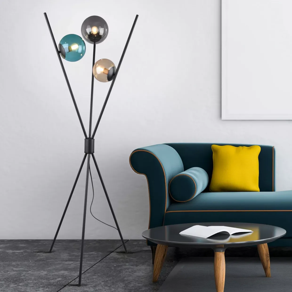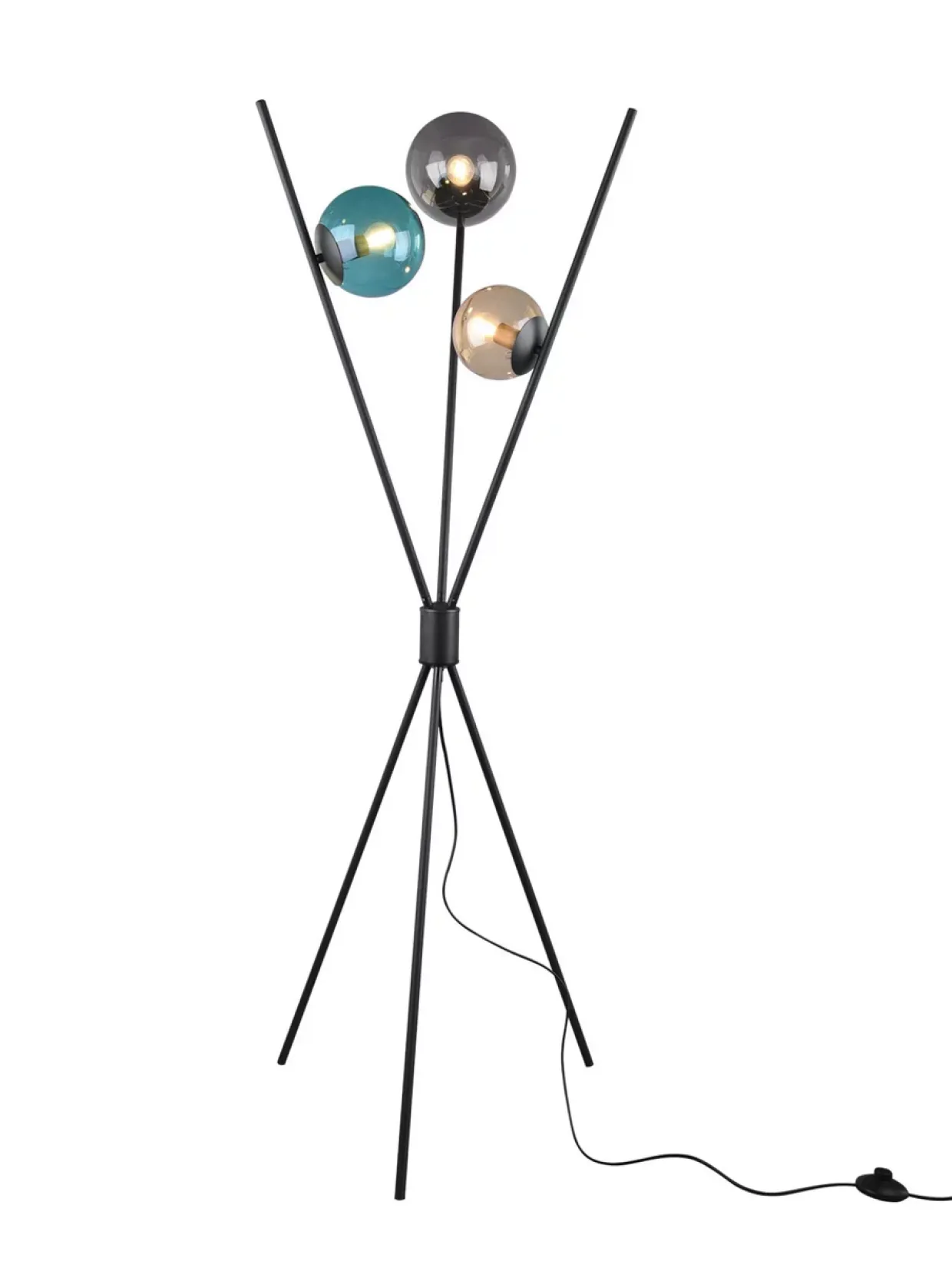 Die dreiflammige Stehleuchte LANCE besticht durch ihr außergewöhnliches Design. Sie ist ein echter Hingucker in Ihrem Wohnzimmer, kann aber auch in Ihrem Büro oder Kinderzimmer ihren Platz finden. Die Leuchte wird über einen Fußschalter bedient, hat eine Höhe von 156 cm und hat einen Durchmesser von 60 cm. Die Metallstangen sind in Schwarz gehalten und mit je einem amberfarbigen, einem türkisen und einem smokefarbenen Glas kombiniert. Für eine energiesparende Beleuchtung empfiehlt sich die Verwendung eines LED Leuchtmittels. Diese sind eine optimale Alternative zu herkömmlichen Halogen Leuchtmitteln und stehen für eine hohe Lichtqualität und eine Energieeinsparung von bis zu 80%. Zusätzlich profitieren Sie bei LED Leuchtmitteln von einer langen Lebensdauer, einer geringen Wärmeentwicklung und schonen gleichzeitig die Umwelt.