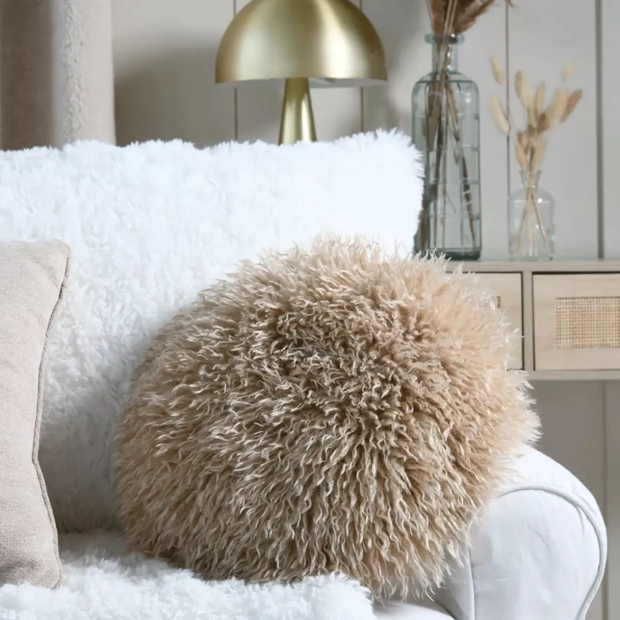 Die Harmonie des Japandi-Stils spiegelt sich in diesem beigen Kissen wider. Die schlichte Eleganz des Designs verbindet die minimalistische Ästhetik Japans mit dem warmen, einladenden Gefühl skandinavischer Gemütlichkeit. Mit einem Durchmesser von 40 cm bietet das Kissen eine ideale Größe, um sich in verschiedenen Wohnbereichen harmonisch einzufügen.