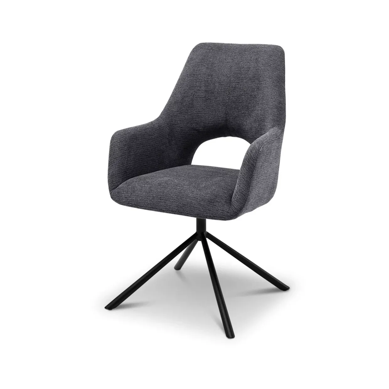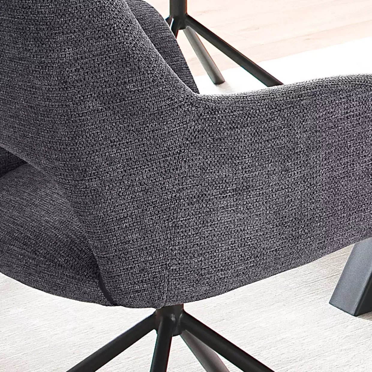 Armlehnstuhl im Bezug Chenille Optik anthrazit. Luxus-Komfort Sitz mit Taschenfederkern. 180 Grad drehbar mit Nivellierung. Gestell Rundrohr, konisch, schwarz matt lackiert.Textilkennzeichnung 100 % Polyester.