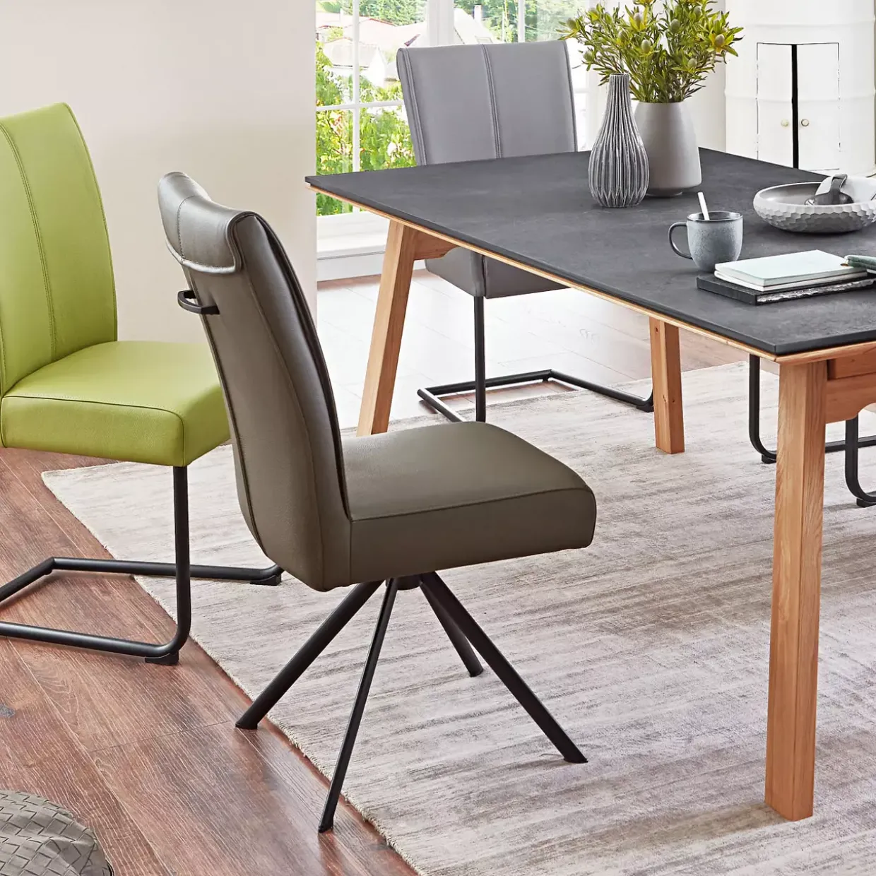 Polsterrücken und Sitzpolster mit Griff sind Merkmale, die den Valeda Stuhl zur idealen Wahl für modernes Wohnen machen. Das Design verbindet Stil mit Funktionalität und bietet in olivgrünem oder schwarzem Leder eine zeitgemäße Ästhetik. Der Stuhl ist nicht nur ein Blickfang, sondern auch praktisch, da er sich um 180° drehen lässt und über eine Rückholfunktion verfügt.