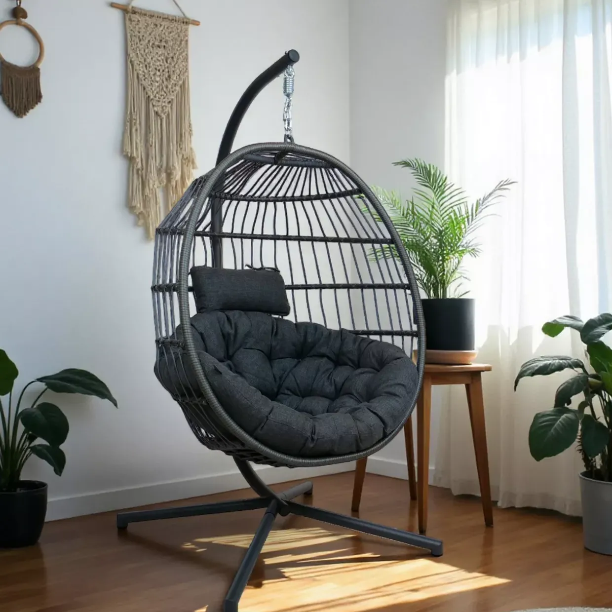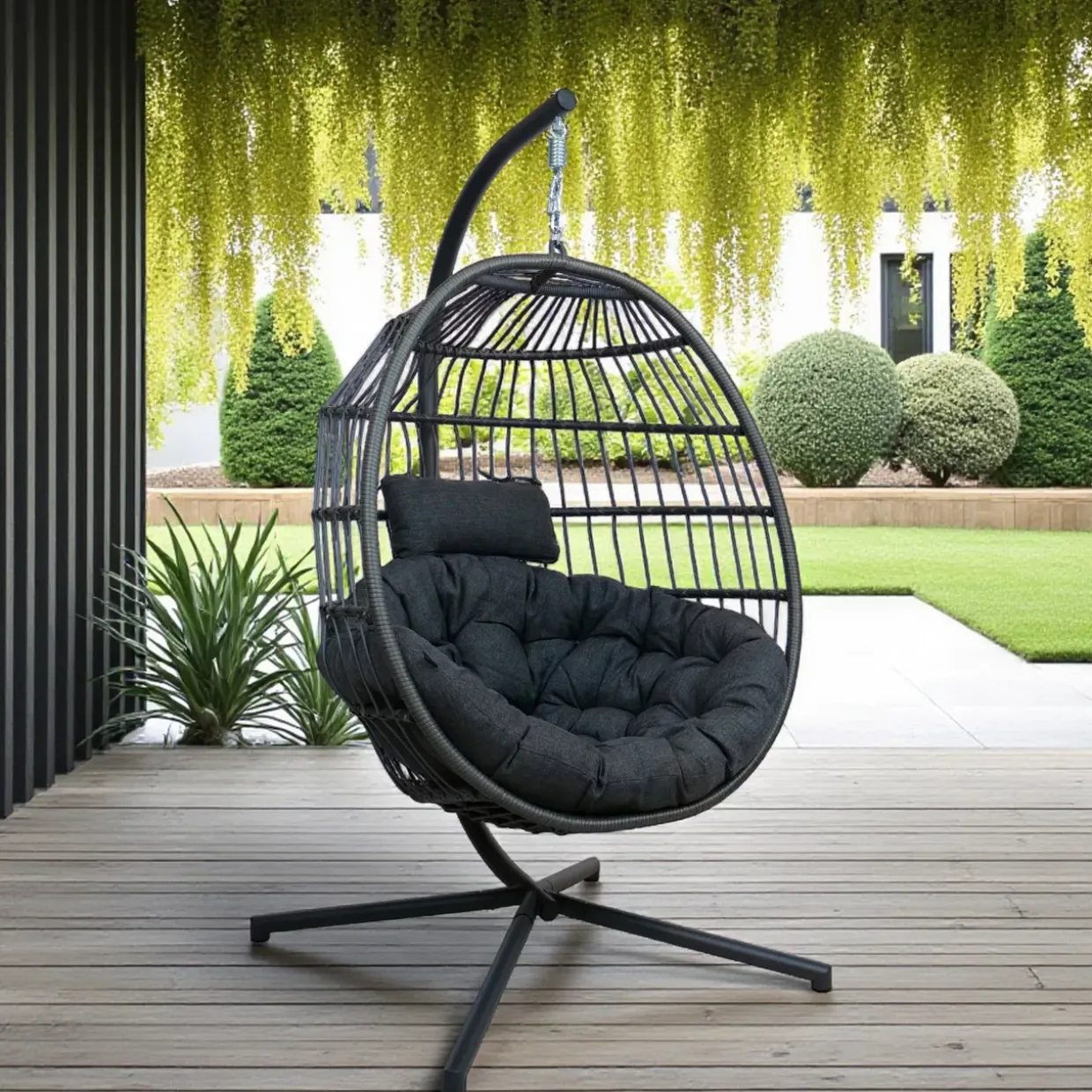 Ein Hauch von Modernität in Anthrazit: Der Hängesessel Folt Meran begeistert mit seinem stilvollen Design und der zeitgemäßen Ästhetik. Aus robustem Aluminium gefertigt, ist er sowohl langlebig als auch leicht, was durch die pulverbeschichtete Oberfläche zusätzlich verstärkt wird. Perfekt für den Sommer, bietet dieser Hängesessel dank seiner wetterbeständigen und UV-beständigen Materialien eine lange Lebensdauer im Außenbereich. Das Olefin-Gewebe sorgt für ein angenehmes Sitzgefühl, das selbst bei intensiver Sonneneinstrahlung nicht nachlässt. Die Knickfunktion verleiht dem Sessel eine zusätzliche Flexibilität, die es ermöglicht, ihn nach Ihren individuellen Bedürfnissen auszurichten.Die durchdachte Konstruktion mit einem 4-Fußgestell garantiert Stabilität und Sicherheit, während die Faltbarkeit des Sessels dafür sorgt, dass er bei Bedarf platzsparend verstaut werden kann. Diese Eigenschaften machen ihn zu einem idealen Begleiter für entspannte Tage im Freien.Einfach in der Pflege, lässt sich der Sessel mit lauwarmem Wasser und mildem Spülmittel mühelos reinigen. So bleibt er auch nach vielen Sommern ein stilvoller Hingucker in Ihrem Garten oder auf Ihrer Terrasse. Genießen Sie entspannte Stunden in einem Hängesessel, der Funktionalität und Ästhetik harmonisch vereint.
