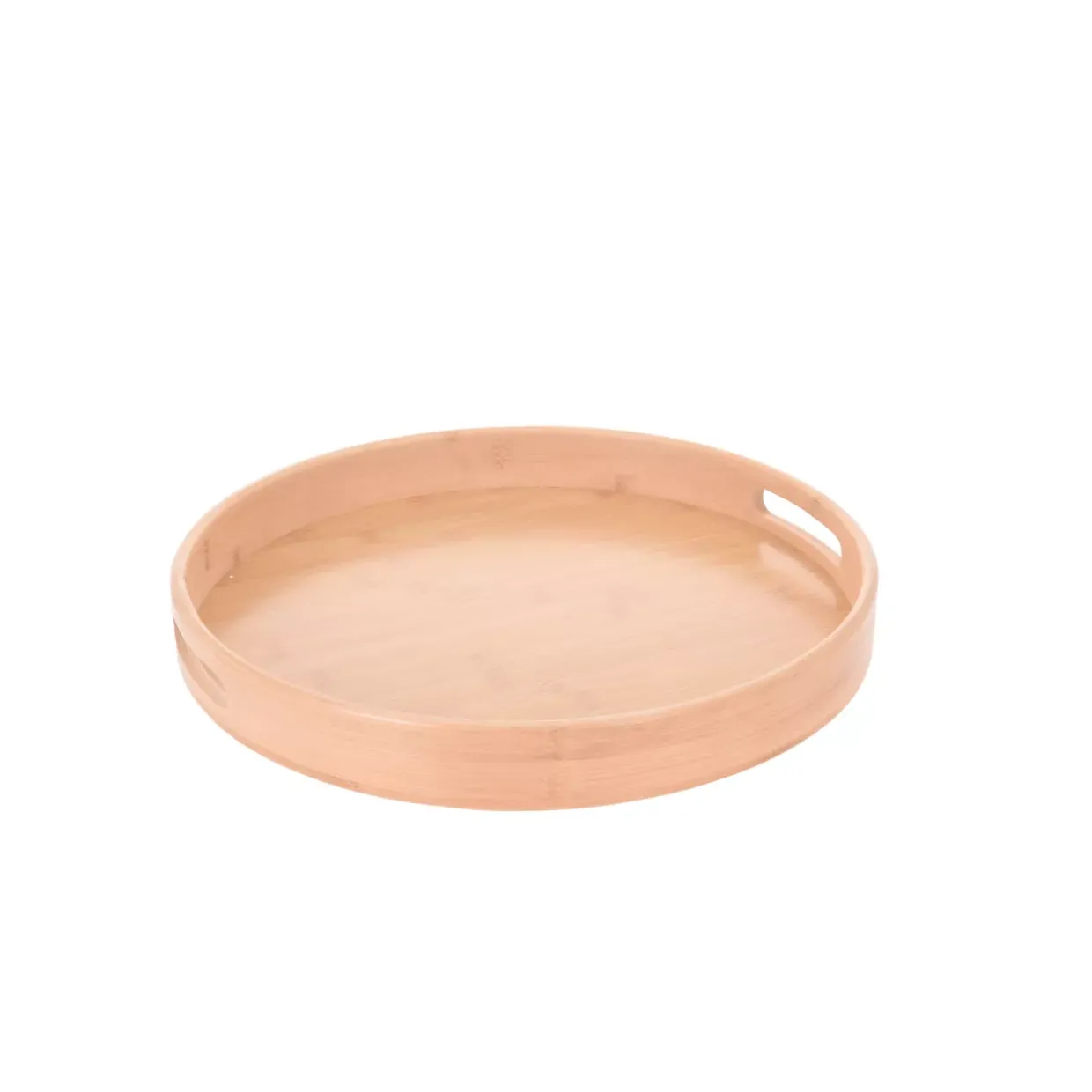 Ein modernes Tablett aus hellbraunem Bambus bringt schlichte Eleganz in jedes Zuhause. Die natürliche Maserung des Holzes verleiht dem Tablett eine warme Ausstrahlung und macht es zu einem Blickfang auf jedem Tisch. Mit einem Durchmesser von 40 cm bietet es ausreichend Platz, um Getränke, Snacks oder dekorative Elemente stilvoll zu präsentieren.