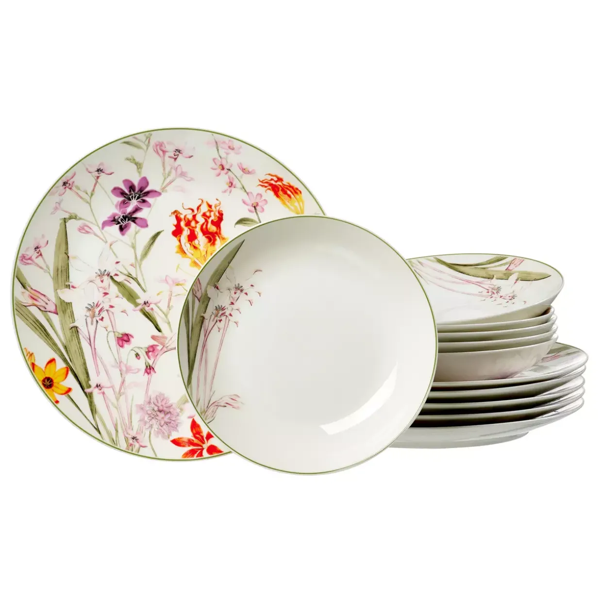 Mit seiner weißen Grundfarbe, die durch bunte Akzente belebt wird, fügt sich das Service harmonisch in jede Tischdekoration ein und bietet vielseitige Gestaltungsmöglichkeiten. Die Verbindung von traditionellem Design und modernen Elementen macht es zu einem zeitlosen Klassiker, der sowohl in ländlichen als auch in urbanen Wohnkonzepten seinen Platz findet. Entdecken Sie die Verbindung von Ästhetik und Funktionalität, die Flora zu einem unverzichtbaren Bestandteil Ihrer Tischkultur macht.