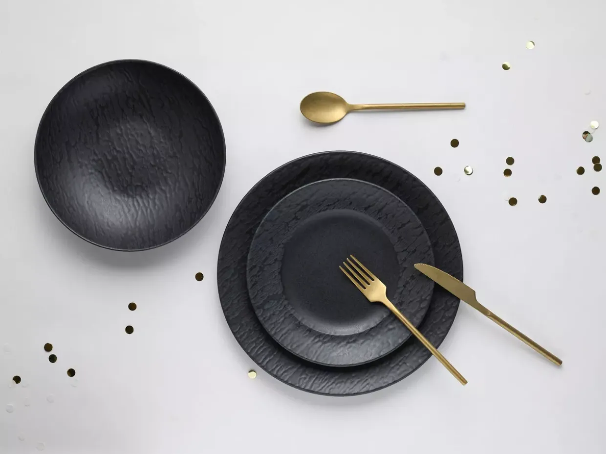 - 12-teiliges Tellerset Keramik schwarz Schieferoptik