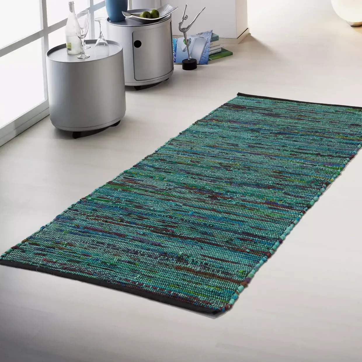 Handweb beidseitig verwendbar Größe: 60x90cm Farbton: Türkis Stil: Modern Muster und Motiv: Handweb Material: Textil Textilart: Baumwolle Flächengewicht: 1500 bestehend aus: 1 Teppich Highlights