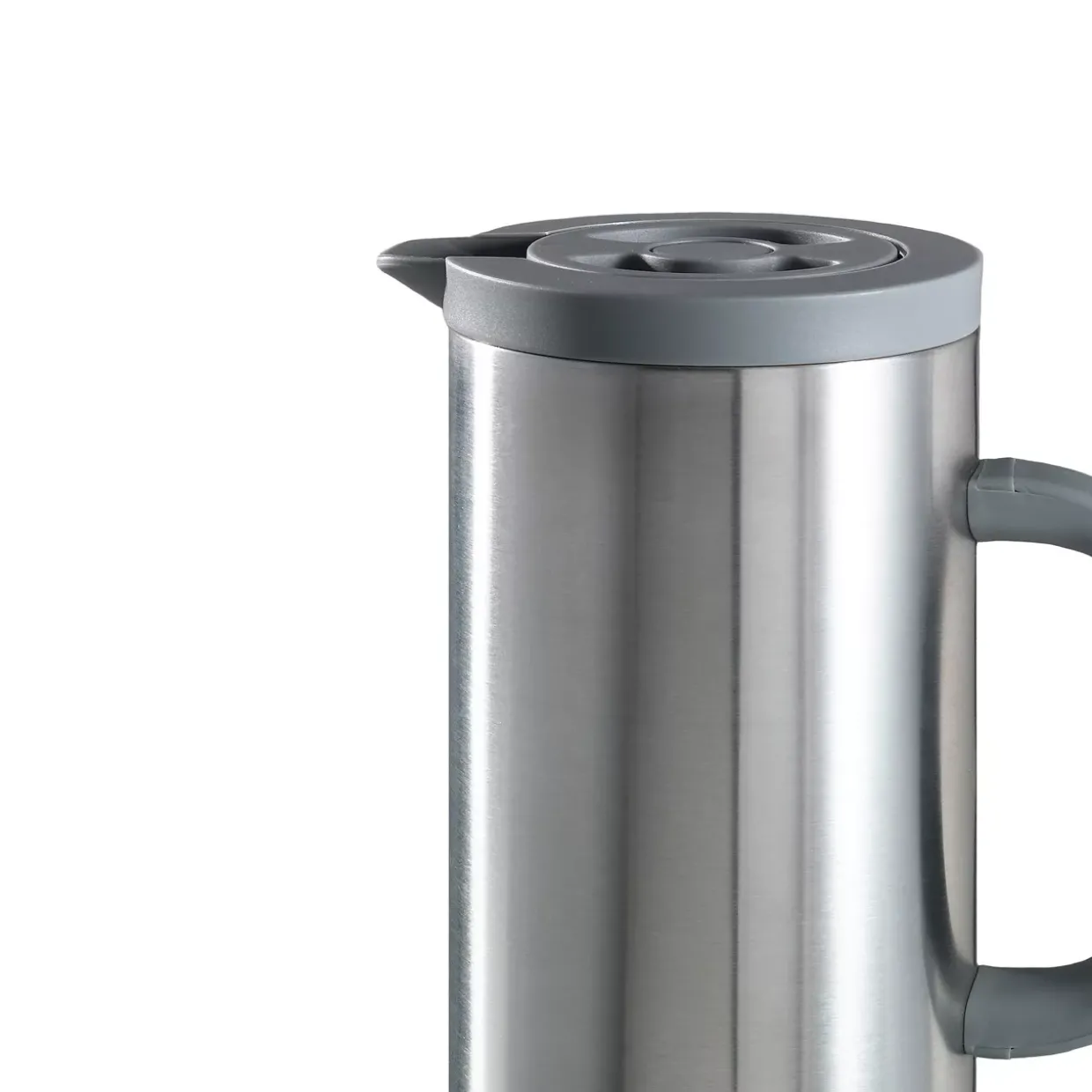 Eleganz in silber und grau prägt das Design dieser modernen Isolierkanne. Kombiniert aus hochwertigen Materialien wie Glas, Kunststoff und Edelstahl, vereint sie Funktionalität und Stil. Der Edelstahl sorgt nicht nur für eine ansprechende Optik, sondern auch für eine langlebige und robuste Nutzung. Mit einem Durchmesser von 11,1 cm passt die Kanne perfekt in die meisten Küchenregale und bietet gleichzeitig eine stabile Standfläche. Die edelstahlverkleidete Oberfläche ist nicht nur ein Blickfang, sondern auch leicht zu reinigen und pflegeleicht. Für langfristige Frische sorgt die hervorragende Füllqualität, die sicherstellt, dass Getränke über einen langen Zeitraum hinweg ihre Temperatur behalten. Ob Sie sich für ein heißes Getränk an einem kalten Wintermorgen oder eine erfrischende Limonade im Sommer entscheiden, die Isolierkanne hält Ihre Getränke auf der gewünschten Temperatur.Der moderne Stil fügt sich nahtlos in eine Vielzahl von Kücheneinrichtungen ein und bietet gleichzeitig eine praktische Lösung für den täglichen Gebrauch. Vertrauen Sie auf die Kombination aus hochwertigem Material und durchdachtem Design, um Ihren Getränken die bestmögliche Aufbewahrung zu bieten. So wird jeder Schluck zu einem kleinen Genussmoment.