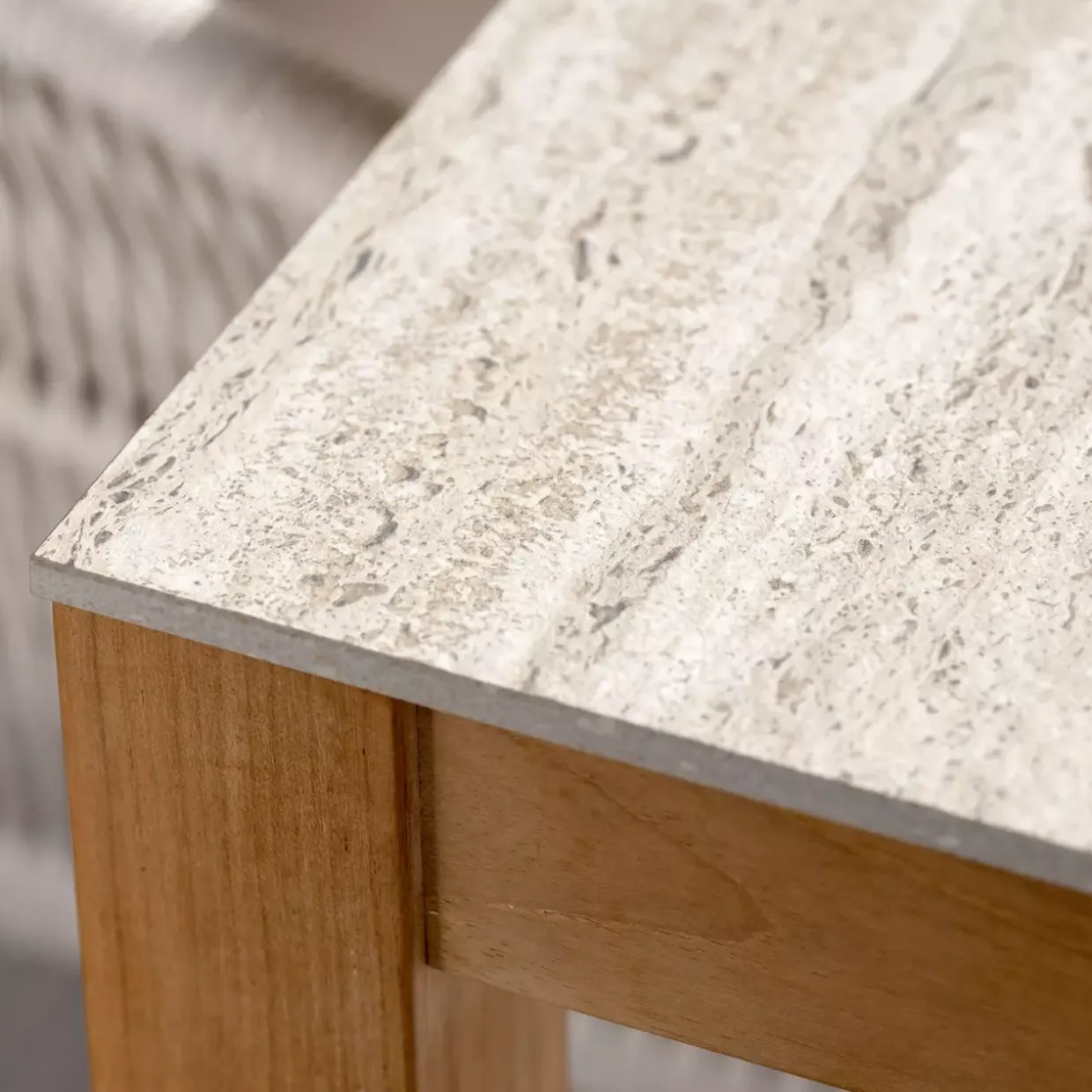 Dieser Tisch eignet sich hervorragend für den Einsatz im Innen- und Außenbereich und passt sich mühelos jedem Einrichtungsstil an. Die Kombination aus Teak und Dekton macht ihn zu einem langlebigen Begleiter für viele Sommer. Die harmonische Farbgebung in Teak und Sediment Beige unterstreicht die natürliche Schönheit des Materials. Ein Tisch, der durch Qualität und Design überzeugt.