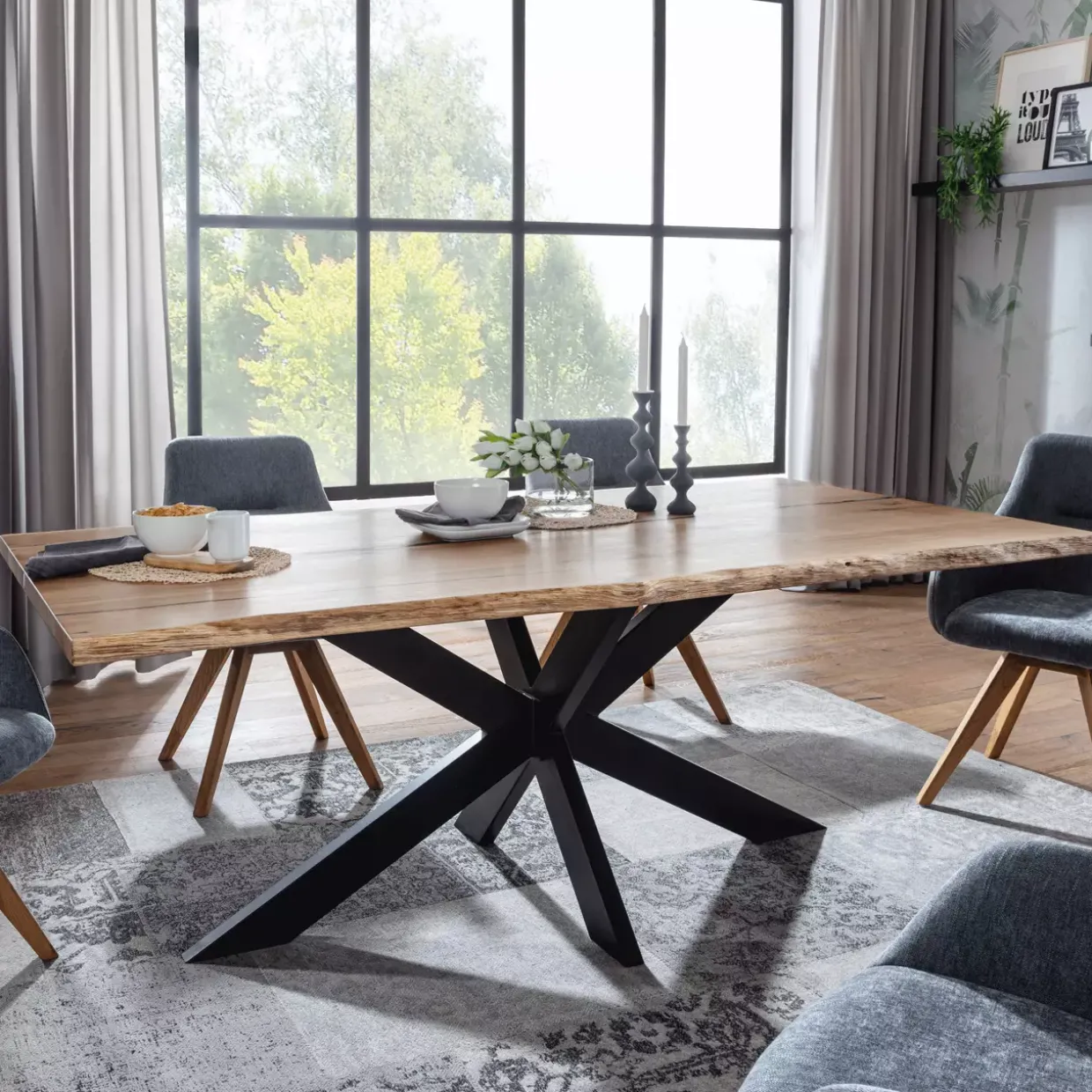 Besonders markant ist die X-Fuß-Konstruktion, die nicht nur für Stabilität sorgt, sondern auch ein Design-Statement setzt. Diese Form harmoniert perfekt mit der klaren Linienführung des Tisches und verleiht ihm eine besondere Raffinesse.