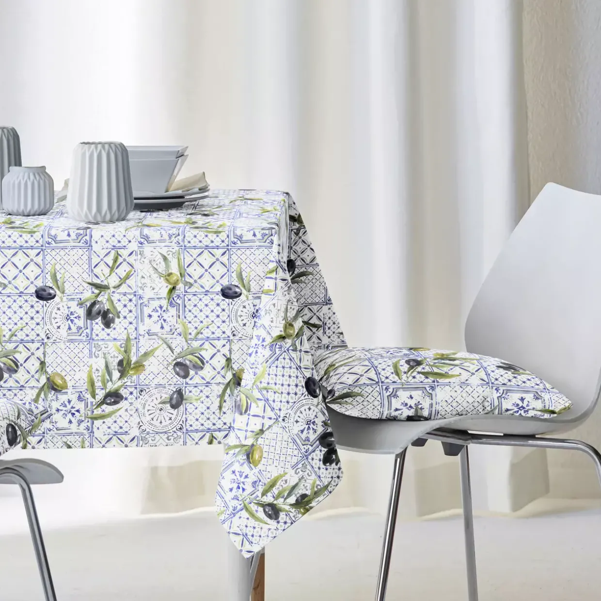 Olivenmotive zieren diese Tischdecke und verleihen jedem gedeckten Tisch mediterranen Charme. In einem natürlichen Stil gehalten, bringt das Modell 6523 88X88 col. 10 die Leichtigkeit des Sommers in Ihr Zuhause. Die harmonische Farbpalette aus Blau, Weiß und Grün fügt sich mühelos in verschiedenste Wohnumgebungen ein.