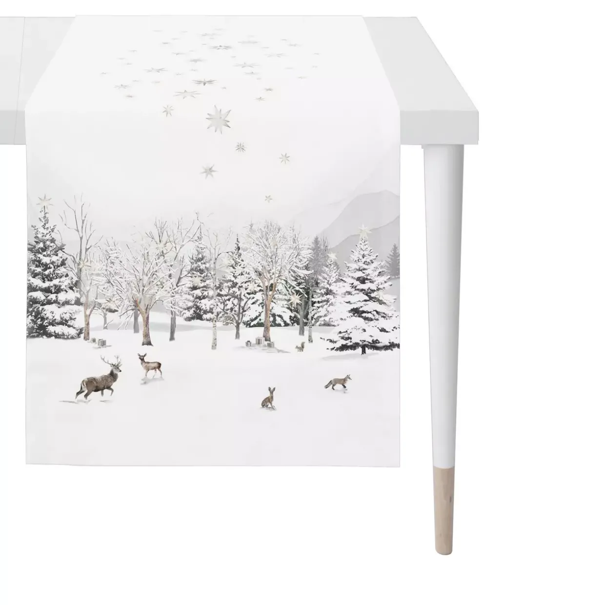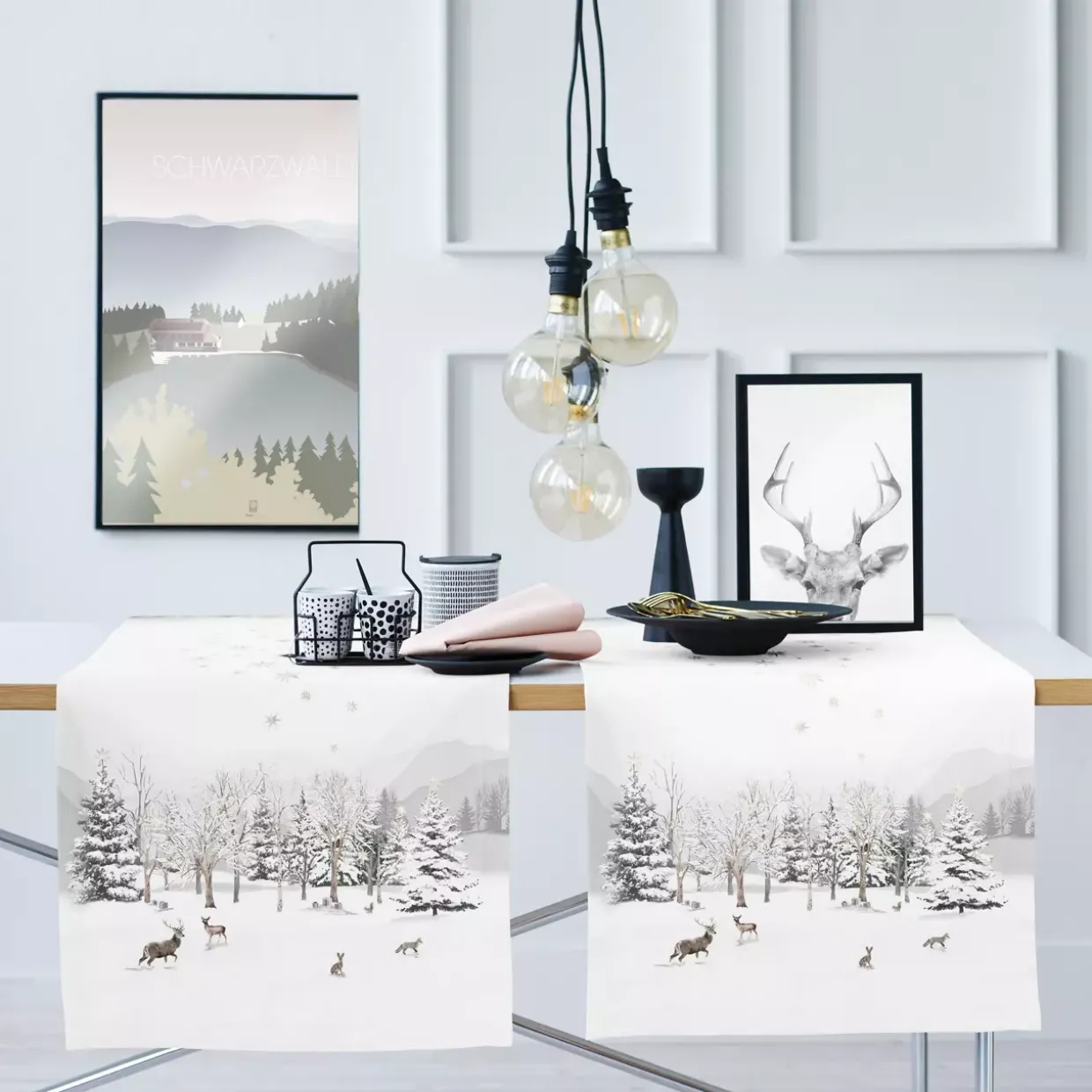 Verschneiter Wald als Muster verleiht diesem Tischläufer eine einzigartige Atmosphäre, die an ruhige Wintertage erinnert. Das rechteckige Design fügt sich nahtlos in moderne Einrichtungsstile ein und ergänzt stilvoll jede Tischdekoration. Die Kombination aus Baumwolle und Polyester sorgt für eine angenehme Haptik und Langlebigkeit, während die graue Farbgebung eine zeitlose Eleganz ausstrahlt.