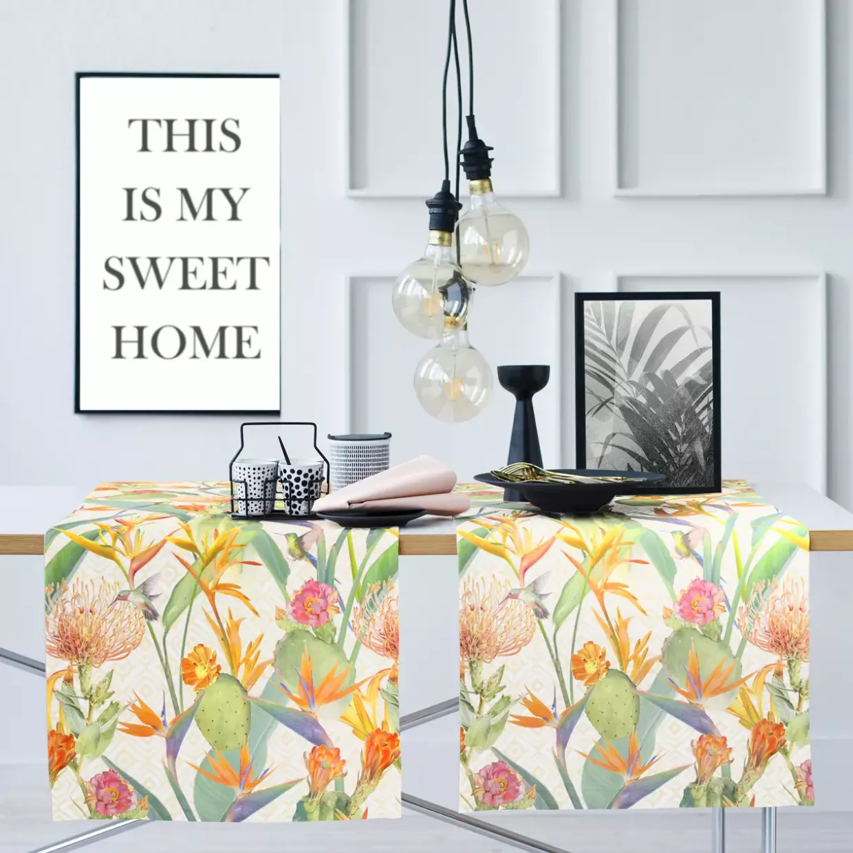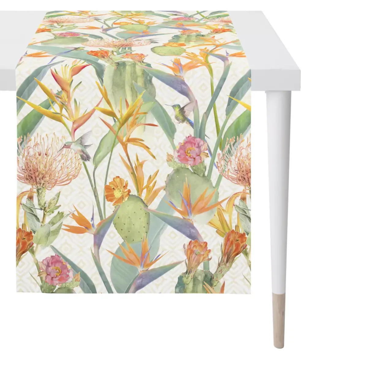 Mit dem Öko Tex Zertifikat ausgezeichnet, steht dieser Tischläufer für umweltfreundliche Textilien, die gesundheitlich unbedenklich sind. Die exotischen Muster laden zu entspannten Sommerabenden ein und bereichern jedes Ambiente. Der Tischläufer ist mehr als nur ein dekoratives Element – er ist eine Einladung, den Sommer zu genießen und ein Stück Natur auf den Tisch zu holen.