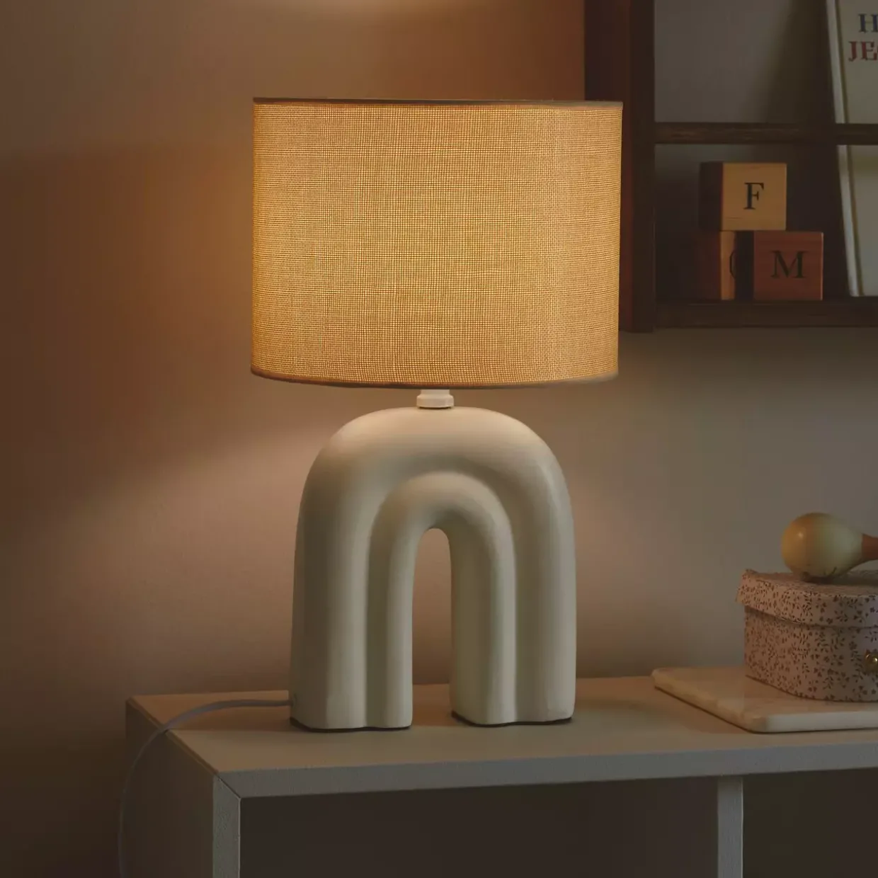 Materialmix: Sockel aus Keramik und Lampenschirm aus Textil