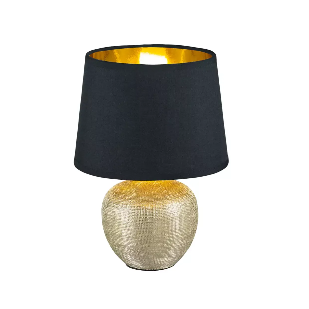 Für die elegante Tischleuchte LUXOR ist schnell der richtige Platz gefunden, ob auf dem Sideboard, im Flur oder im Schlafbereich als Akzentlicht, die moderne Leuchte ist in jedem Wohnbereich ein wahrer Blickfang. Die Tischleuchte mit Schnurschalter hat einen Durchmesser von 18 cm und eine Höhe von 26 cm. Der goldfarbige Keramikfuß sorgt für ein angenehmes Ambiente und harmoniert perfekt mit dem schwarzen Stoffschirm der von innen ebenfalls golffarbig ist. Für eine energiesparende Beleuchtung empfiehlt sich die Verwendung eines LED Leuchtmittels. Diese sind eine optimale Alternative zu herkömmlichen Halogen Leuchtmitteln und stehen für eine hohe Lichtqualität und eine Energieeinsparung von bis zu 80%. Zusätzlich profitieren Sie bei LED Leuchtmitteln von einer langen Lebensdauer, einer geringen Wärmeentwicklung und schonen gleichzeitig die Umwelt.