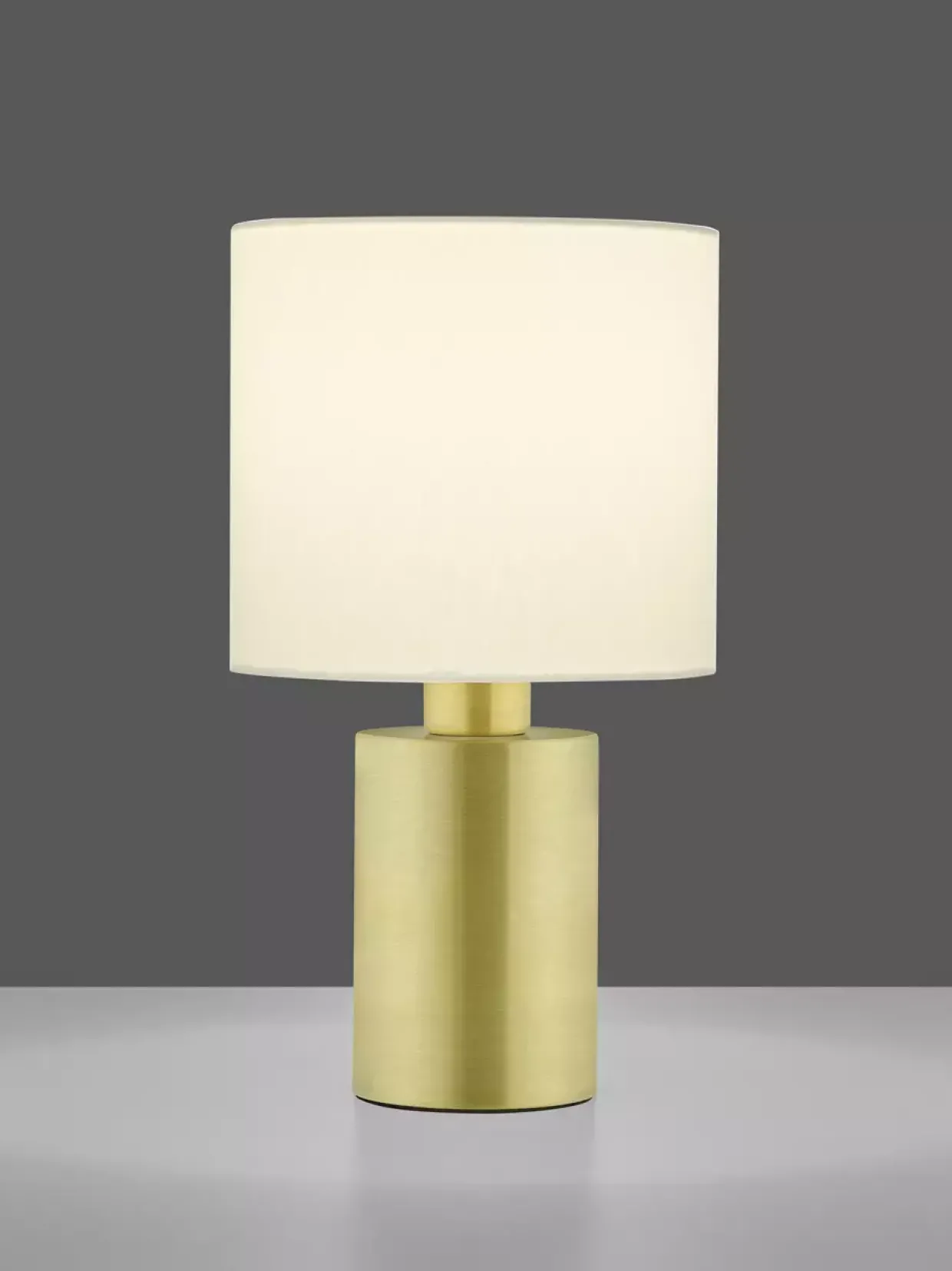 Metallfuß: messing gebürstet; Stoffschirm: weiß; Fassung E27, Leuchtmittel 1*25W (exkl.); Lampenshirm: D20*H18cm; Metallfuß: D8*H13cm; schwarzes PVC Kabel (150cm) mit Kabelschalter