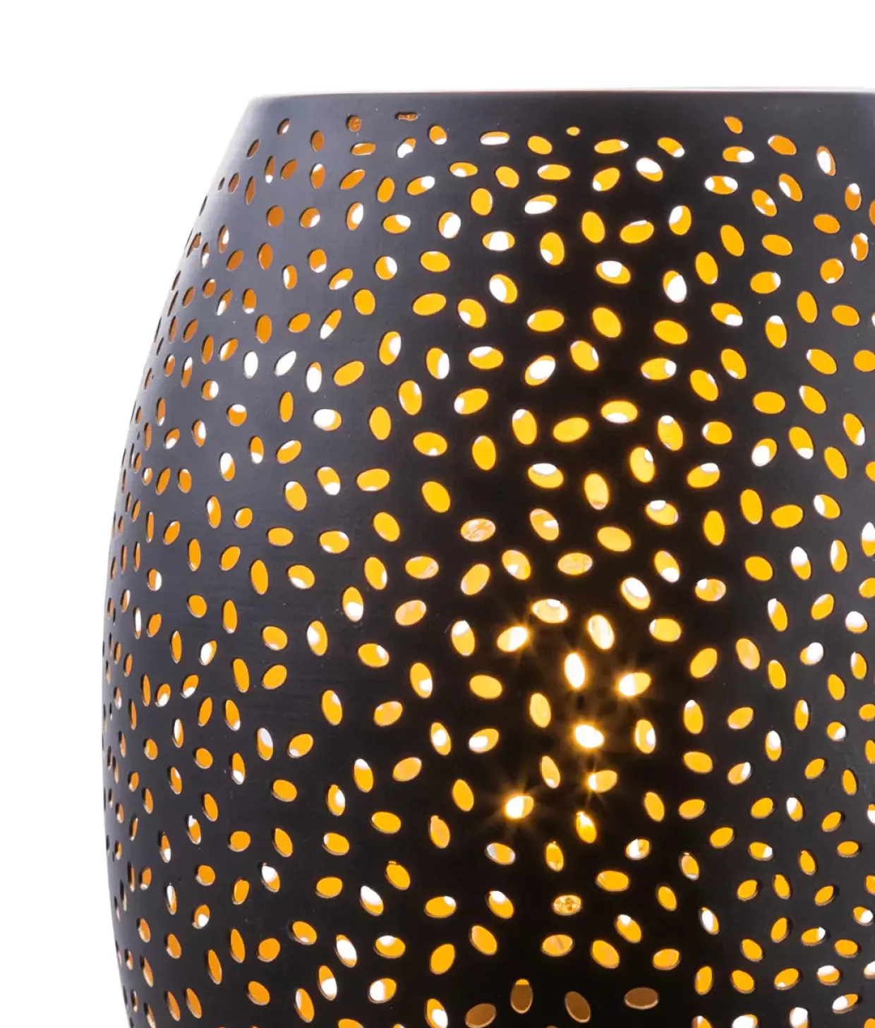 Tischleuchte Metall goldfarben, Metall schwarz matt, goldfarben Dekorstanzungen, Wippschalter am Kabel, ø: 150mm, H: 230mm, Kabellänge 1500mm, exkl. 1x E27 40W 230V