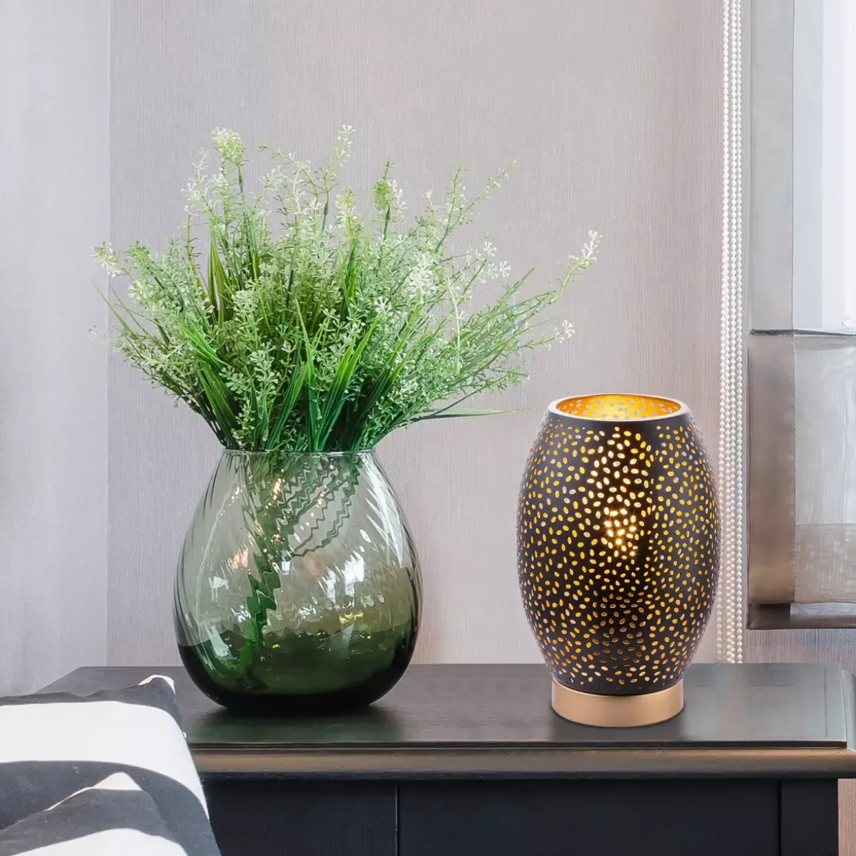 Ein Hauch von Eleganz in goldfarben/schwarz – die Tischleuchte NARRI bringt modernen Stil in Ihr Zuhause. Gefertigt aus hochwertigem Metall, überzeugt diese Leuchte durch ihre matte Oberfläche, die einen edlen Akzent in jedem Raum setzt. Mit einem Durchmesser von 15 cm ist sie kompakt genug, um auf jedem Tisch oder Regal Platz zu finden, ohne aufdringlich zu wirken.