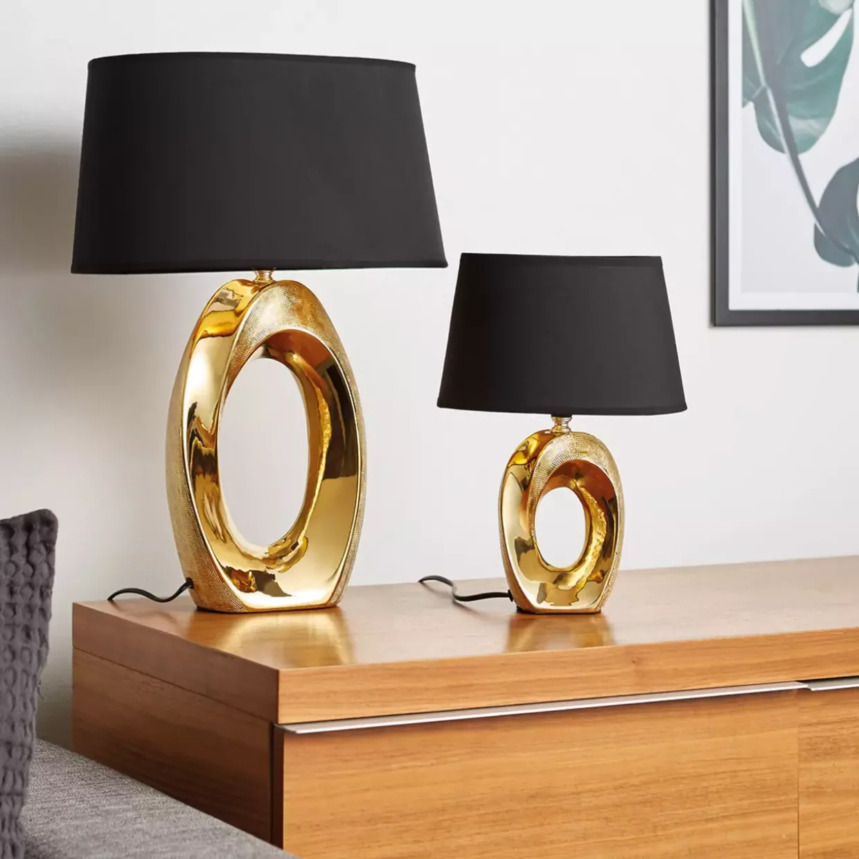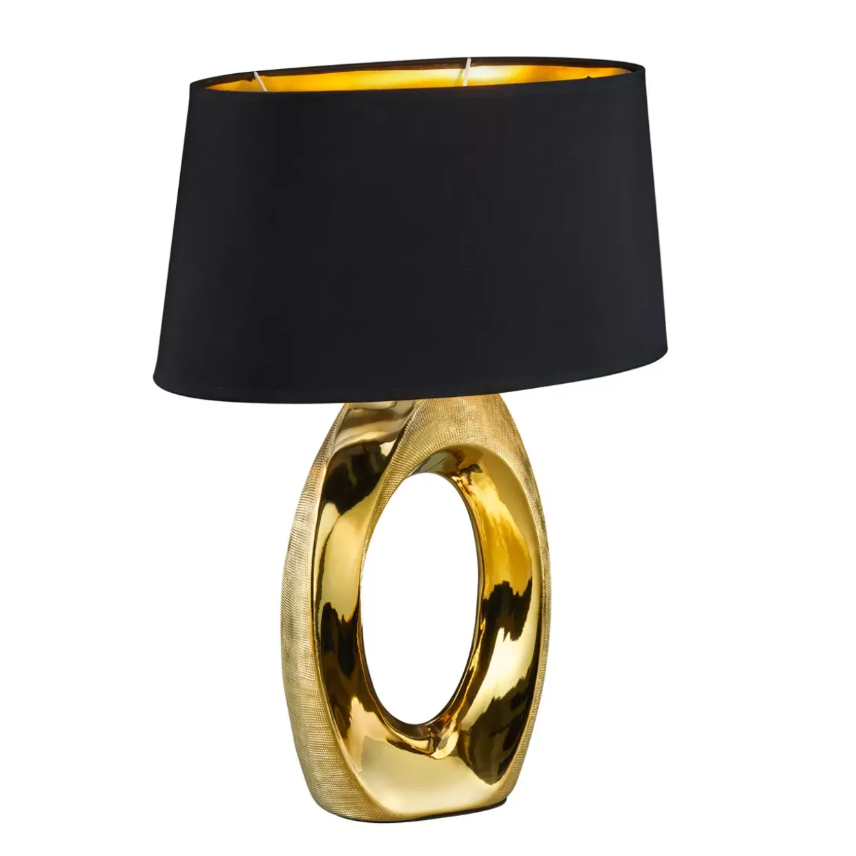 Die Tischleuchte TABA aus Keramik vereint modernes Design mit aktuellen Farbkombinationen und macht sie zu einem wahren Schmuckstück. Die Tischleuchte zaubert für jeden Stil die passende Lichtstimmung und ist mit einer Größe von 38x52cm unglaublich dekorativ. Ob als Nachtischleuchte im Schlafzimmer, auf der Kommode oder auf dem kleinen Beistelltisch im Wohnzimmer, die Leuchte wird auch tagsüber zu einem echten Blickfang. Die Farbkombination Schwarz-Gold liegt zudem absolut im Trend und lässt die Leuchte und ihre Umgebung edel und modern erscheinen. Für eine energiesparende Beleuchtung empfiehlt sich die Verwendung eines LED Leuchtmittels. Diese sind eine optimale Alternative zu herkömmlichen Halogen Leuchtmitteln und stehen für eine hohe Lichtqualität und eine Energieeinsparung von bis zu 80%. Zusätzlich profitieren Sie bei LED Leuchtmitteln von einer langen Lebensdauer, einer geringen Wärmeentwicklung und schonen gleichzeitig die Umwelt.