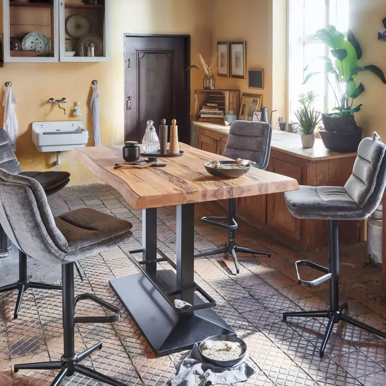 Geölt und sorgfältig verarbeitet, bietet die Oberfläche der Tischplatte nicht nur Schutz, sondern betont auch die natürliche Maserung des Holzes. Diese Art der Behandlung sorgt dafür, dass das Holz atmen kann und seine Schönheit über Jahre hinweg bewahrt bleibt. Die Tischplatte ist eine hervorragende Basis für kreative Einrichtungsideen, sei es in der Küche, im Esszimmer oder im Wohnzimmer.
