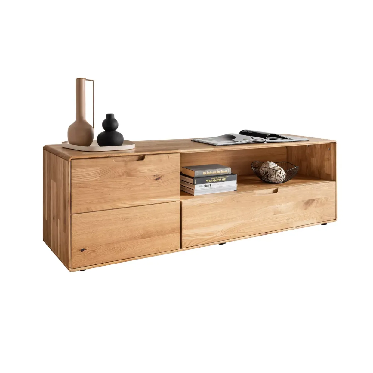 Ein Hauch von Natur zieht in Ihr Wohnzimmer ein mit dem TV-Board aus geölter Wildeiche. Diese besondere Holzart bringt Wärme und Charakter in Ihre Räume und schafft eine gemütliche Atmosphäre. Die natürliche Maserung und die sanfte Farbgebung machen dieses Möbelstück zu einem zeitlosen Begleiter in Ihrem Zuhause.Mit dem TV-Board setzen Sie nicht nur auf Stil, sondern auch auf Funktionalität. Ausgestattet mit der innovativen Soft-Close-Technologie, schließen Schubladen und Türen sanft und leise, was den alltäglichen Komfort erhöht und das Material schont. Diese durchdachte Funktion ist ideal für ein ruhiges und harmonisches Wohnerlebnis.Die hochwertige Verarbeitung des Möbelstücks zeigt sich in jedem Detail. Das robuste Holz bietet nicht nur eine ansprechende Optik, sondern auch Langlebigkeit und Stabilität. Die wilde Eiche, sorgfältig geölt, unterstreicht den natürlichen Stil und lässt sich mühelos in verschiedene Wohnkonzepte integrieren.Ob für moderne oder klassische Einrichtungen, das TV-Board aus geölter Wildeiche erweist sich als vielseitig und anpassungsfähig. Es strahlt eine zeitlose Eleganz aus und wird zum Herzstück Ihrer Medienlandschaft. Lassen Sie sich von der harmonischen Verbindung aus Design und Funktionalität inspirieren und genießen Sie ein Stück Natur in Ihrem Zuhause.