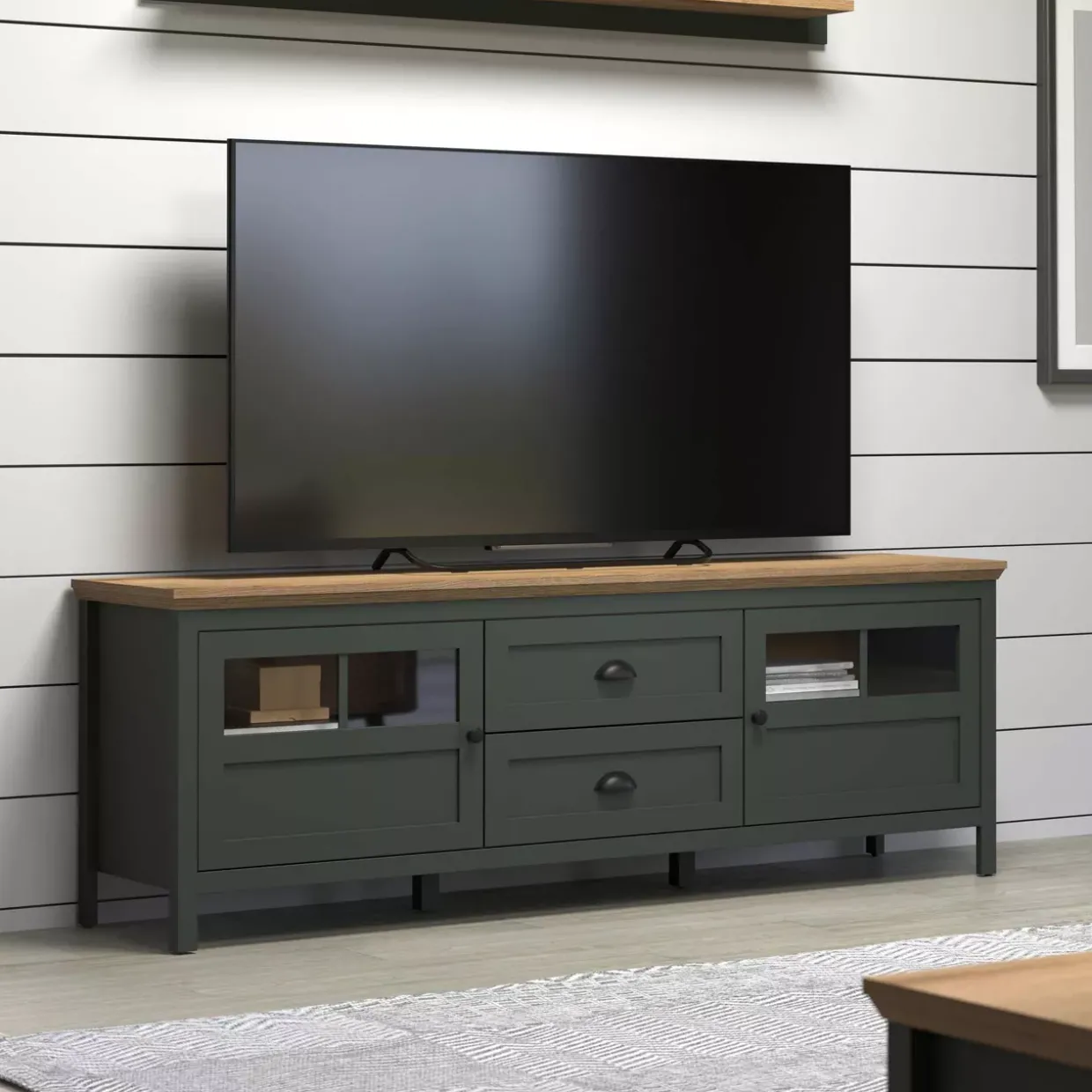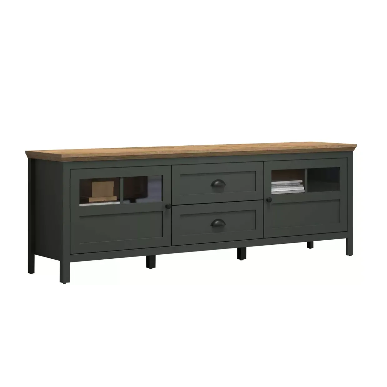 Stanton, ein TV-Lowboard im Cottage-Stil, bietet mit seiner eleganten Drehtür ein harmonisches Design für Ihr Wohnambiente. Die Farbgebung aus tiefem Tannengrün und der warmen Absetzung in Evoke Eiche verleiht jedem Raum eine natürliche und einladende Atmosphäre. Vielseitigkeit und Stabilität sind durch die Mehrfuß-Konstruktion gewährleistet, die das Möbelstück zuverlässig trägt.