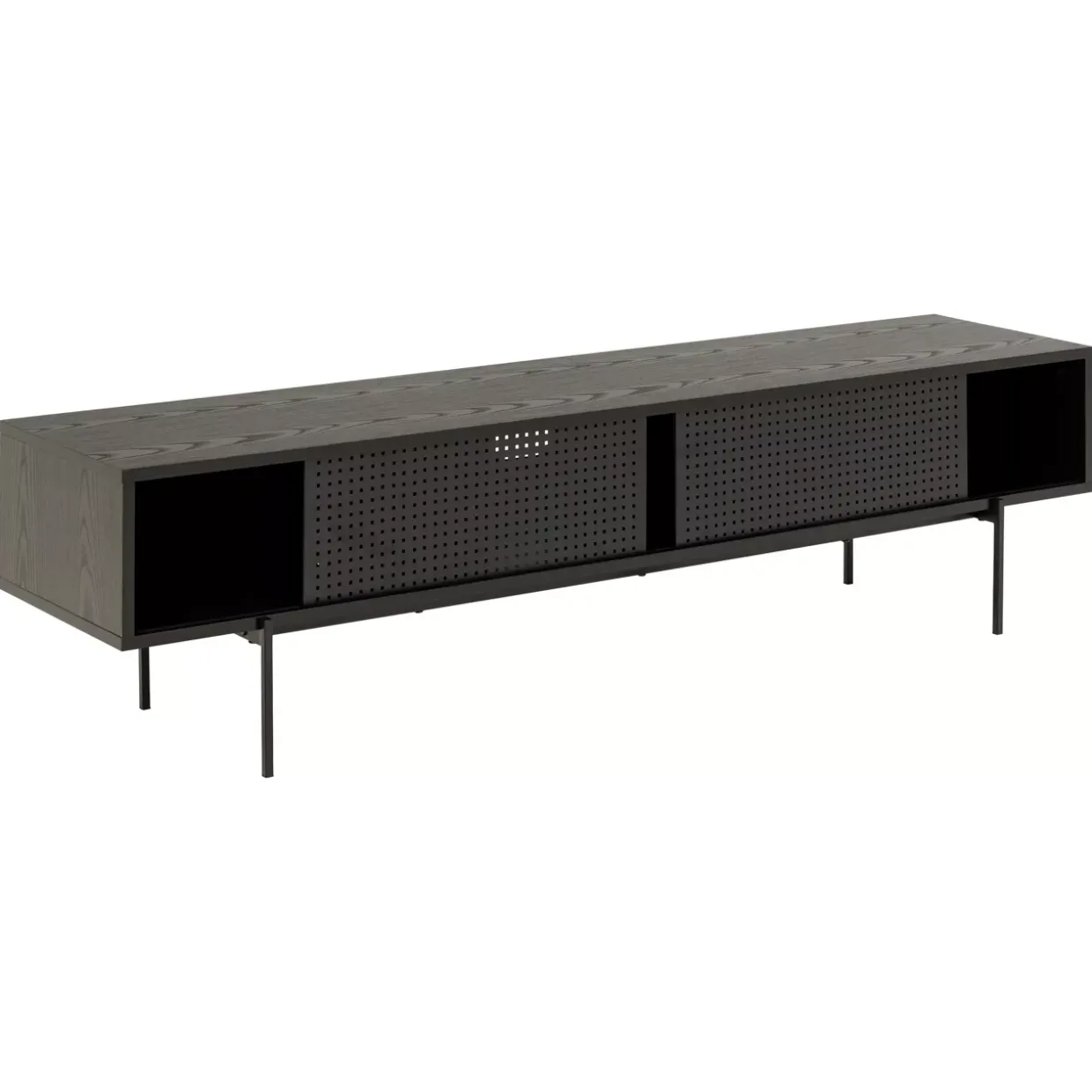 Angus ist ein moderner TV-Tisch, der durch seine elegante Kombination aus Holzwerkstoff und Metall besticht. Die stilvolle schwarze Eschenoptik wird durch die schwarze Schiebetür aus Metall-Mesh perfekt ergänzt und verleiht Ihrem Wohnraum einen zeitgemäßen Look. Zwei dieser durchdachten Möbelstücke bieten nicht nur Platz für Ihre Unterhaltungselektronik, sondern auch praktische Funktionen, die den Alltag erleichtern.