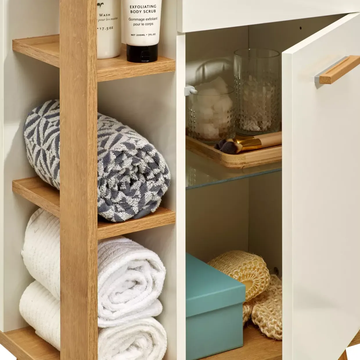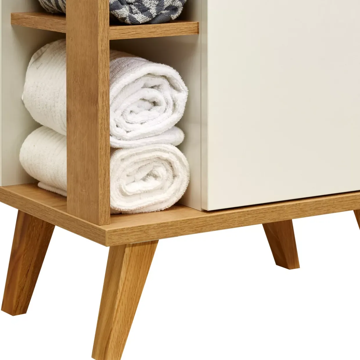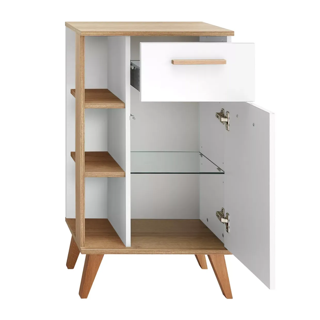 Farbton: Korpus Weiß Seidenglanz / Füße Riviera Eiche Nachbildung / Front Weiß Seidenglanz / Griffe Holz