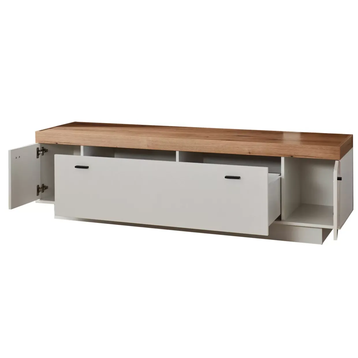 Schubkästen mit Unterflurführung und Dämpfung zeichnen das Bilbao Unterteil aus. Diese durchdachte Funktionalität sorgt für ein sanftes und leises Schließen der Schubkästen, was den Alltag angenehmer gestaltet. Die gelungene Kombination aus Weiß Dekor und Eiche Evoke Dekor verleiht diesem Möbelstück eine zeitlose Eleganz, die sich nahtlos in verschiedene Einrichtungsstile integrieren lässt. Zwei Türen und ein Doppelschubkasten bieten ausreichend Stauraum für Ihre persönlichen Gegenstände. Ob im Wohnzimmer, Esszimmer oder in der Diele – dieses Möbelstück ist vielseitig einsetzbar und überzeugt durch seine klare Linienführung und das konventionelle Design. Gefertigt aus hochwertigem Holzwerkstoff, vereint das Bilbao Unterteil Langlebigkeit mit einem modernen Look. Die Materialwahl sorgt nicht nur für Stabilität, sondern auch für eine ansprechende Optik, die den Raum aufwertet. Ein stilvolles und zugleich praktisches Möbelstück, das durch sein durchdachtes Design und die Kombination aus Funktionalität und Ästhetik besticht. Es bietet eine hervorragende Möglichkeit, Wohnräume zu organisieren und dabei einen Hauch von Eleganz zu verbreiten. Lassen Sie sich von der Balance zwischen Form und Funktion begeistern und entdecken Sie die Vielseitigkeit dieses Möbelstücks.