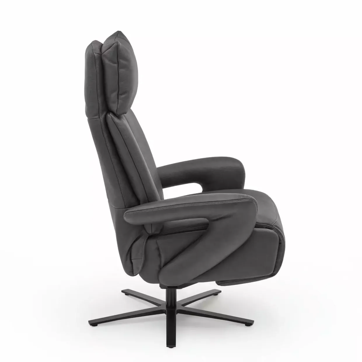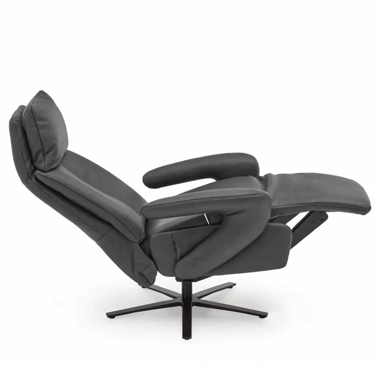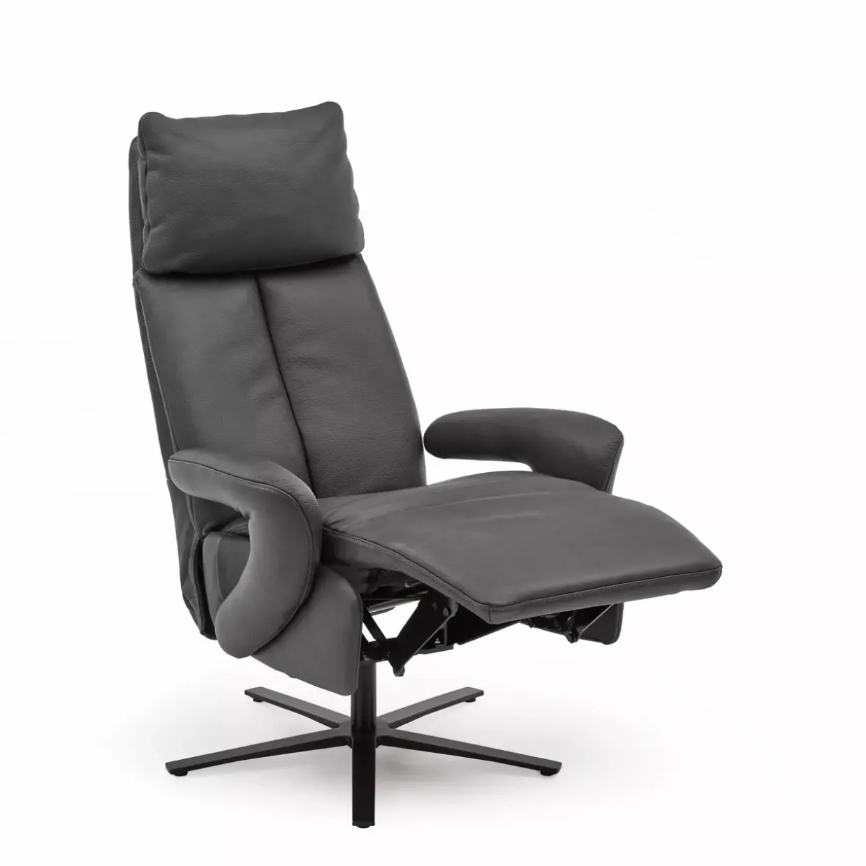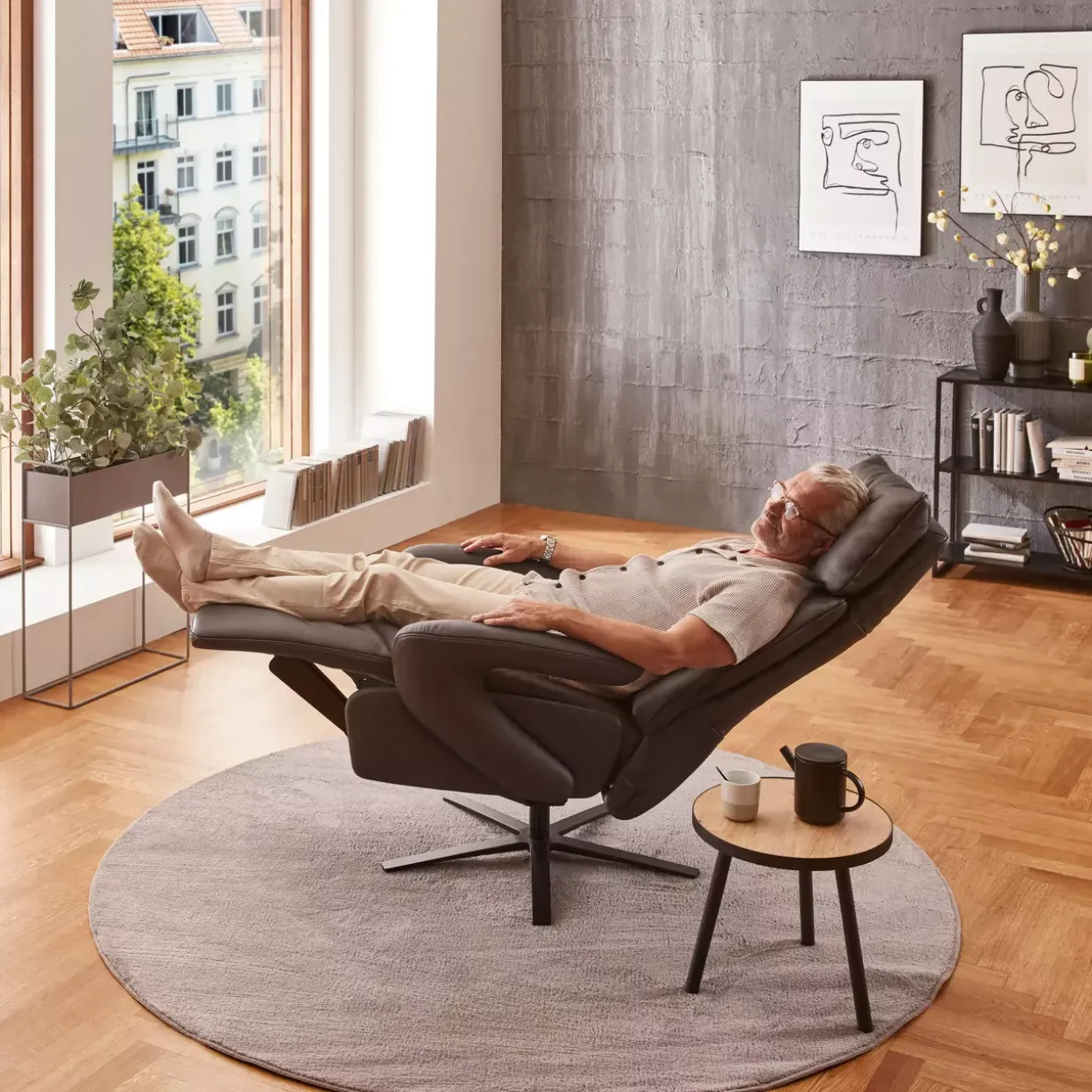 Eleganz trifft auf Funktionalität: Der Drehstuhl in Leder Reno anthrazit vereint stilvoll konventionelles Design mit modernem Komfort. Die manuelle Verstellung der Fußstütze, ausgestattet mit einem extra langen Fußteil, sorgt für optimalen Komfort. Dank der stufenlosen Verstellbarkeit durch leichten Körperdruck können Sie mühelos in die Liegeposition gleiten und entspannen.Mit einem Sternfuß aus hochwertigem Metall steht dieser Stuhl für Stabilität und Langlebigkeit. Die Kopfteilverstellung lässt sich individuell anpassen und bietet durch einen Rastbeschlag mit Rückholfeder zusätzliche Flexibilität. Der Echtbezug am Rücken garantiert ein durchgängiges, luxuriöses Sitzgefühl.Der Drehstuhl besticht durch seine lackierte Oberfläche und die Ton-in-Ton Kontrastnaht, die ihm eine dezente, aber edle Optik verleiht. Die Kombination aus Leder und Metall strahlt eine zeitlose Eleganz aus, die sich in jedem Raum harmonisch einfügt.Die Polsterung aus PUR-Schaum bietet hervorragenden Sitzkomfort, während die Relaxfunktion für zusätzliche Entspannung sorgt. Dieser Stuhl ist nicht nur ein Möbelstück, sondern ein Ort der Erholung und des Wohlbefindens. Lassen Sie sich von der Balance aus Komfort und Stil inspirieren und genießen Sie das Gefühl von Luxus in Ihrem Alltag.