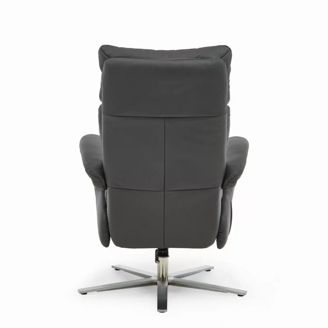 Die elegante Kombination aus Leder Evita anthrazit und Edelstahl verleiht diesem Drehstuhl eine zeitlose Ästhetik. Ein Highlight ist die Kontrastnaht Ton in Ton, die das Design stilvoll abrundet. Der Sternfuß aus Metall sorgt für Stabilität und fügt sich harmonisch in das Gesamtbild ein.
